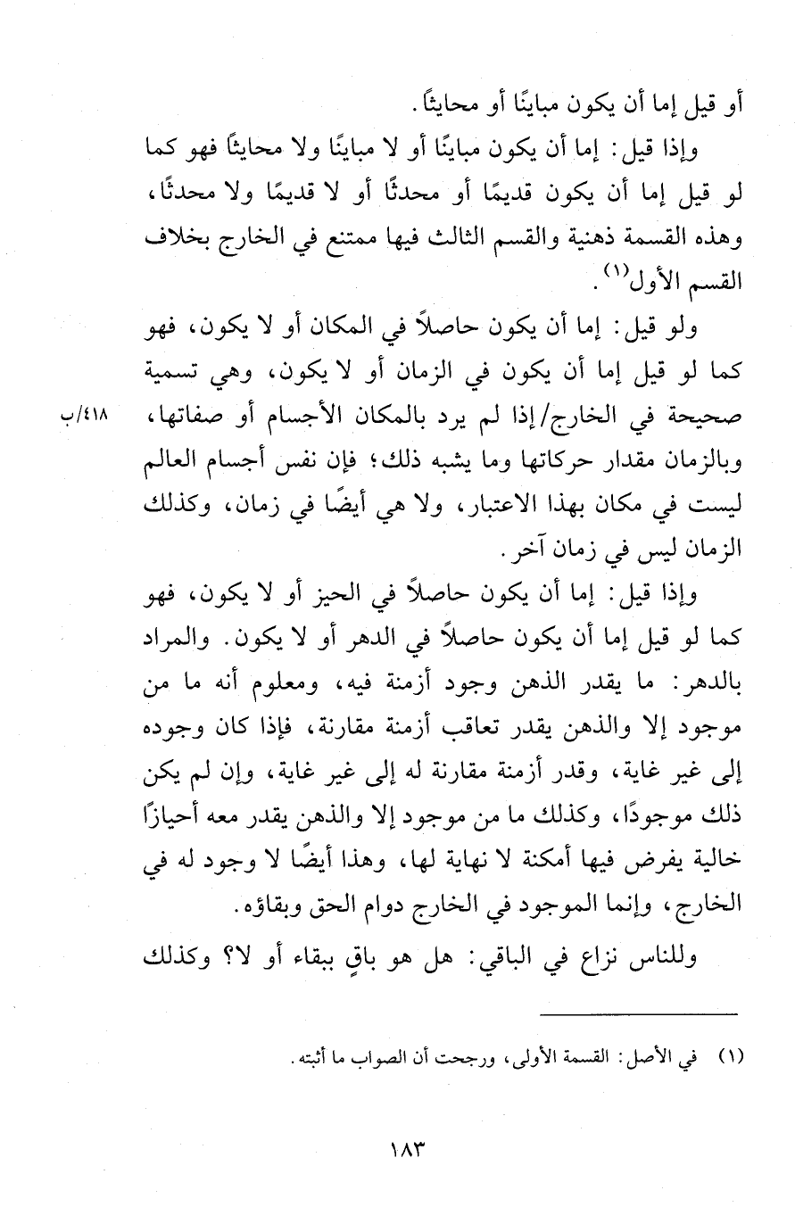 أو قيل إما أن يكون مباينًا أو محايثًا وإذا قيل إما أن يكون مباينًا أو لا مباينًا ولا محايثًا فهو كما لو قيل إما أن يكون قديمًا أو محدثًا أو لا قديمًا ولا محدثًا وهذه القسمة ذهنية والقسم الثالث فيها ممتنع في الخارج بخلاف القسم الأول ولو قيل إما أن يكون حاصلاً في المكان أو لا يكون فهو كما لو قيل إما أن يكون في الزمان أو لا يكون وهي تسمية صحيحة في الخارج إذا لم يرد بالمكان الأجسام أو صفاتها وبالزمان مقدار حركاتها وما يشبه ذلك فإن نفس أجسام العالم ليست في مكان بهذا الاعتبار ولا هي أيضًا في زمان وكذلك الزمان ليس في زمان آخر وإذا قيل إما أن يكون حاصلاً في الحيز أو لا يكون فهو كما لو قيل إما أن يكون حاصلاً في الدهر أو لا يكون والمراد بالدهر ما يقدر الذهن وجود أزمنة فيه ومعلوم أنه ما من موجود إلا والذهن يقدر تعاقب أزمنة مقارنة فإذا كان وجوده إلى غير غاية وإن لم يكن ذلك موجودًا وكذلك ما من موجود إلا والذهن يقدر معه أحيازًا خالية يفرض فيها أمكنة لا نهاية لها وهذا أيضًا لا وجود له في الخارج وإنما الموجود في الخارج دوام الحق وبقاؤه وللناس نزاع في الباقي هل هو باقٍ ببقاء أو لا وكذلك