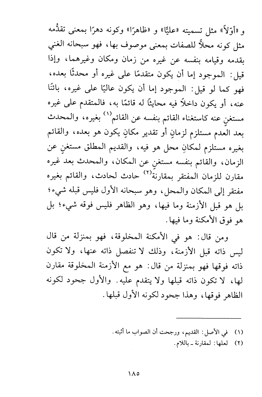 وأوّلاً مثل تسميته عليًّا وظاهرًا وكونه دهرًا بمعنى تقدُّمه مثل كونه محلاًّ للصفات بمعنى موصوف بها فهو سبحانه الغني بقدمه وقيامه بنفسه عن غيره من زمان ومكان وغيرهما وإذا قيل الموجود إما أن يكون متقدمًا على غيره أو محدثًا بعده فهو كما لو قيل الموجود إما أن يكون عاليًا على غيره بائنًا عنه أو يكون داخلاً فيه محايثًا له قائمًا به فالمتقدم على غيره مستغنٍ كاستغناء القائم بنفسه عن القائم بغيره والمحدث بعد العدم مستلزم لزمانٍ أو تقدير مكانٍ يكون هو بعده والقائم بغيره مستلزم لمكانِ محل هو فيه والقديم المطلق مستغنٍ عن الزمان والقائم بنفسه مستغنٍ عن المكان والمحدث بعد غيره مقارن للزمان المفتقر بمقارنة حادث لحادث والقائم بغيره مفتقر إلى المكان والمحل وهو سبحانه الأول فليس قبله شيء بل هو قبل الأزمنة وما فيها وهو الظاهر فليس فوقه شيء بل هو فوق الأمكنة وما فيها ومن قال هو في الأمكنة المخلوقة فهو بمنزلة من قال ليس ذاته قبل الأزمنة وذلك لا تنفصل ذاته عنها ولا تكون ذاته فوقها فهو بمنزلة من قال هو مع الأزمنة المخلوقة مقارن لها لا تكون ذاته قبلها ولا يتقدم عليه والأول جحود لكونه الظاهر فوقها وهذا جحود لكونه الأول قبلها