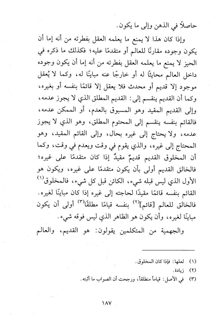 حاصلاً في الذهن وإلى ما يكون وإذا كان هذا لا يمنع ما يعلمه العقل بفطرته من أنه إما أن يكون وجوده مقارنًا للعالم أو متقدمًا عليه فكذلك ما ذكره في الحيز لا يمنع ما يعلمه العقل من فطرته من أنه إما أن يكون وجوده داخل العالم محايثّا له أو خارجًا عنه مباينًا له وكما لا يُعقل موجود إلا قديم أو محدث فلا يعقل إلا قائمًا بنفسه أو بغيره وكما أن القديم ينقسم إلى القديم المطلق الذي لا يجوز عدمه وإلى القديم المقيد وهو المسبوق بالعدم أو الممكن عدمه فالقائم بنفسه ينقسم إلى المحتوم المطلق وهو الذي لا يجوز عدمه ولا يحتاج إلى غيره بحال وإلى القائم المقيد وهو المحتاج إلى غيره والذي يقوم في وقت ويعدم في وقت وكما أن المخلوق القديم قديمٌ مقيدٌ إذا كان متقدمًا على غيره فالخالق القديم أولى بأن يكون متقدمًا على غيره ويكون هو الأول الذي ليس قبله شيء الكائن قبل كل شيء فالمخلوق القائم بنفسه قائمًا مقيدًا لحاجته إلى غيره إذا كان مباينًا لغيره فالخالق للعالم قائم بنفسه قيامًا مطلقًا أولى أن يكون مباينًا لغيره وأن يكون هو الظاهر الذي ليس فوقه شيء والجهمية من المتكلمين يقولون هو القديم والعالم