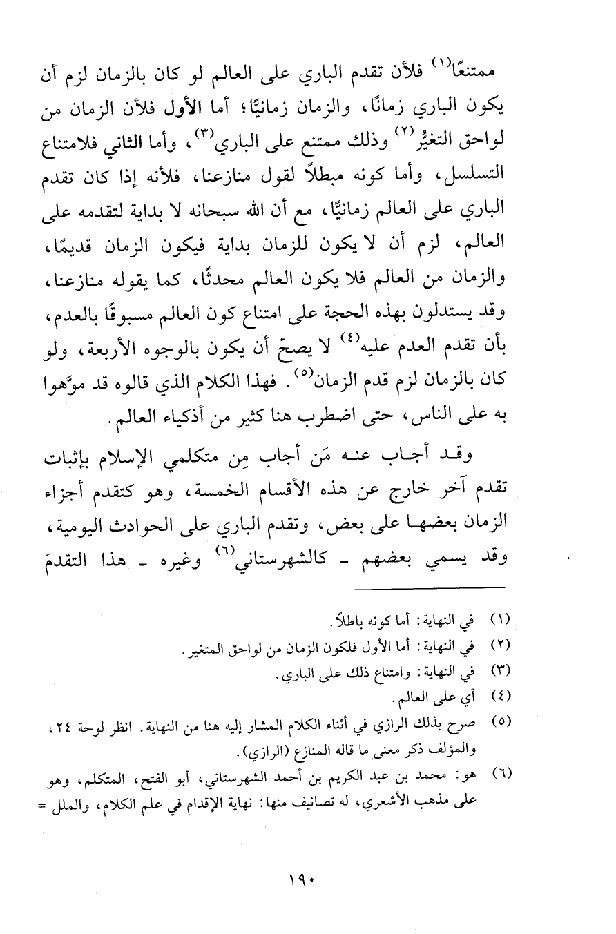 ممتنعًا فلأن تقدم الباري على العالم لو كان بالزمان لزم أن يكون الباري زمانًا والزمان زمانيًّا أما الأول فلأن الزمان من لواحق التغيُّر وذلك ممتنع على الباري وأما الثاني فلامتناع التسلسل وأما كونه مبطلاً لقول منازعنا فلأنه إذا كان تقدم الباري على العالم زمانيًّا مع أن الله سبحانه لا بداية لتقدمه على العالم لزم أن لا يكون للزمان بداية فيكون الزمان قديمًا والزمان من العالم فلا يكون العالم محدثًا كما يقوله منازعنا وقد يستدلون بهذه الحجة على امتناع كون العالم مسبوقًا بالعدم بأن تقدم العدم عليه لا يصحّ أن يكون بالوجوه الأربعة ولو كان بالزمان لزم قدم الزمان فهذا الكلام الذي قالوه قد موَّهوا به على الناس حتى اضطرب هنا كثير من أذكياء العالم وقد أجاب عنه مَن أجاب مِن متكلمي الإسلام بإثبات تقدم آخر خارج هذه الأقسام الخمسة وهو كتقدم أجزاء الزمان بعضها على بعض وتقدم الباري على الحوادث اليومية وقد يسمي بعضهم كالشهرستاني وغيره هذا التقدمَ