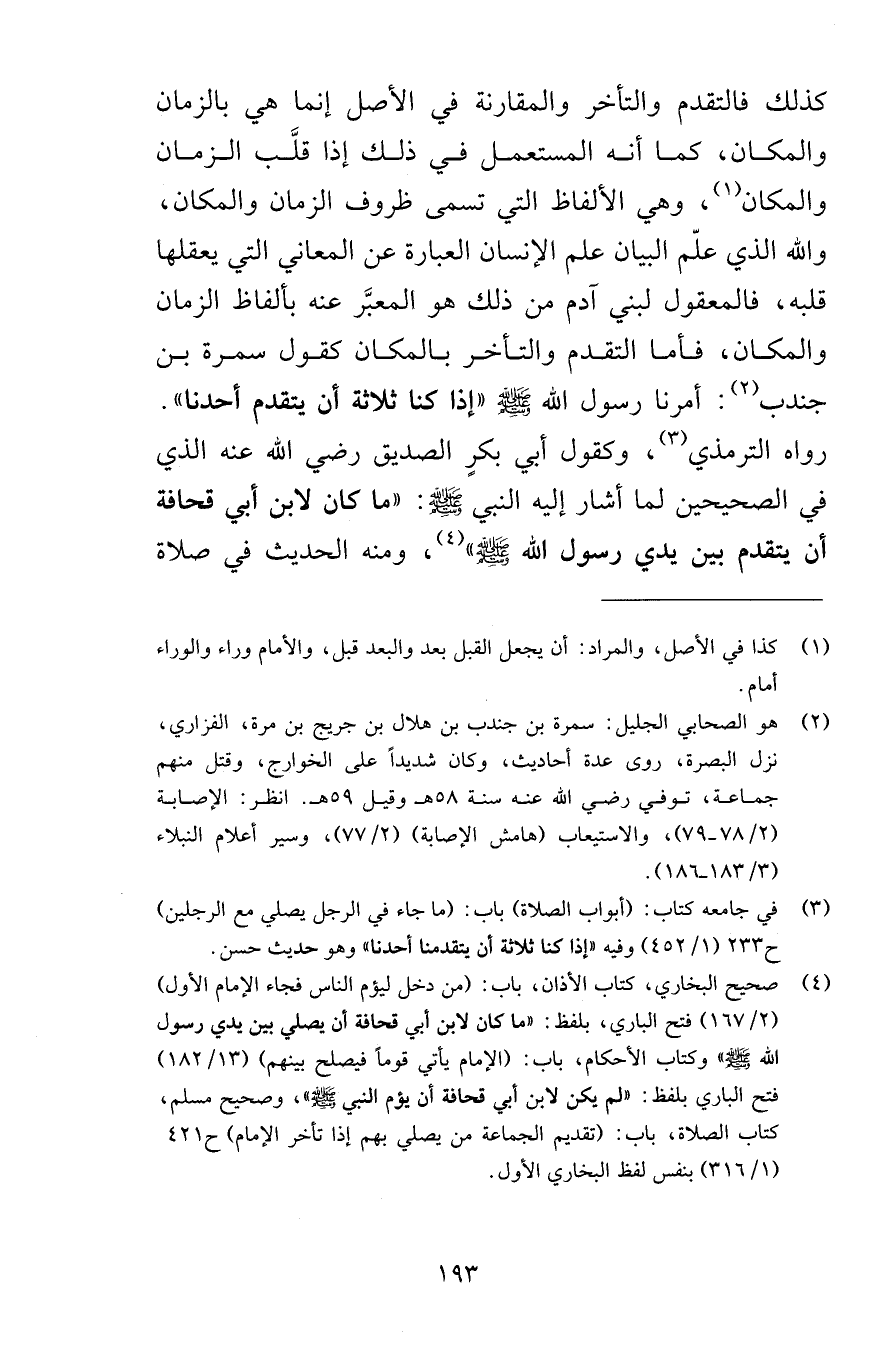 كذلك فالتقدم والتأخر والمقارنة في الأصل إنما هي بالزمان والمكان كما أنه المستعمل في ذلك إذا قلَّب الزمان والمكان وهي الألفاظ التي تسمى ظروف الزمان والمكان والله الذي علّم البيان علم الإنسانة العبارة عن المعاني التي يعقلها قلبه فالمعقول لبني آدم من ذلك هو المعبَّر عنه بألفاظ الزمان والمكان فأما التقدم والتأخر بالمكان كقول سمرة بن جندب أمرنا رسول الله صلى الله عليه وسلم إذا كنا ثلاثة أن يتقدم أحدنا رواه الترمذي وكقول أبي بكرٍ الصديق رضي الله عنه الذي في الصحيحين لما أشار إليه النبي صلى الله عليه وسلم ما كان لابن أبي قحافة أن يتقدم بين يدي رسول الله صلى الله عليه وسلم ومنه الحديث في صلاة