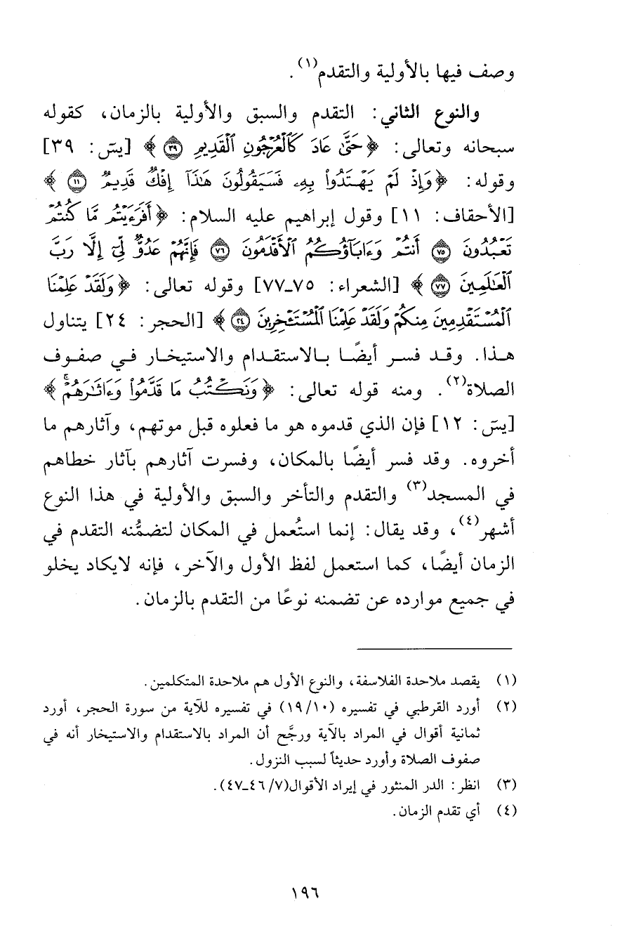 وصف فيها بالأولية والتقدم والنوع الثاني التقدم والسبق والأولية بالزمان كقوله سبحانه وتعالى حَتَّى عَادَ كَالْعُرْجُونِ الْقَدِيمِ {39} [يس 39] وقوله وَإِذْ لَمْ يَهْتَدُوا بِهِ فَسَيَقُولُونَ هَذَا إِفْكٌ قَدِيمٌ {11} [الأحقاف 11] وقول إبراهيم عليه السلام أَفَرَأَيْتُم مَّا كُنتُمْ تَعْبُدُونَ {75} أَنتُمْ وَآبَاؤُكُمُ الْأَقْدَمُونَ {76} فَإِنَّهُمْ عَدُوٌّ لِّي إِلَّا رَبَّ الْعَالَمِينَ {77} [الشعراء 75-77] وقوله تعالى وَلَقَدْ عَلِمْنَا الْمُسْتَقْدِمِينَ مِنكُمْ وَلَقَدْ عَلِمْنَا الْمُسْتَأْخِرِينَ {24} [الحجر 24] يتناول هذا وقد فسر أيضًا بالاستقدام والاستيخار في صفوف الصلاة ومنه قوله تعالى وَنَكْتُبُ مَا قَدَّمُوا وَآثَارَهُمْ [يس 12] فإن الذي قدموه هو ما فعلوه قبل موتهم وآثارهم ما أخروه وقد فسر أيضًا بالمكان وفسرت آثارهم بآثار خطاهم في المسجد والتقدم والتأخر والسبق والأولية في هذا النوع أشهر وقد يقال إنما استُعمل في المكان لتضمُّنه التقدم في الزمان أيضًا كما استعمل لفظ الأول والآخر فإنه لا يكاد يخلو في جميع موارده عن تقدمه نوعًا من التقدم بالزمان