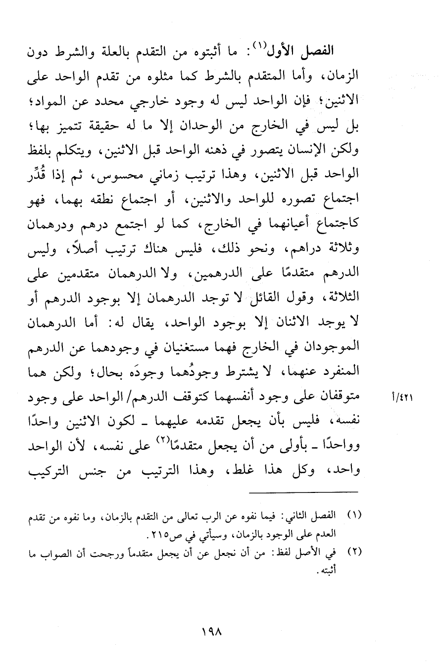 الفصل الأول ما أثبتوه من التقدم بالعلة والشرط دون الزمان وأما المتقدم بالشرط كما مثلوه من تقدم الواحد على الاثنين فإن الواحد ليس له وجود خارجي محدد عن المواد بل ليس في الخارج من الوحدان إلا ما له حقيقة تتميز بها ولكن الإنسان يتصور في ذهنه الواحد قبل الاثنين ويتكلم بلفظ الواحد قبل الاثنين وهذا ترتيب زماني محسوس ثم إذا قُدِّر اجتماع تصوره للواحد والاثنين أو اجتماع نطقه بهما فهو كاجتماع أعيانهما في الخارج كما لو اجتمع درهم ودرهمان وثلاثة دراهم ونحو ذلك فليس هناك ترتيب أصلاً وليس الدرهم متقدم على الدرهمين ولا الدرهمان متقدمان على الثلاثة وقول القائل لا توجد الدرهمان إلا بوجود الدرهم أو لا يوجد الاثنان إلا بوجود الواحد يقال له أما الدرهمان الموجودان في الخارج فهما مستغنيان في وجودهما عن الدرهم المنفرد عنهما لا يشترط وجودُهما وجودَه بحال ولكن هما متوقفان على وجود أنفسهما كتوقف الدرهم الواحد على وجود نفسه فليس بأن يجعل تقدمه عليهما لكون الاثنين واحدًا وواحدًا بأولى من أن يجعل متقدمًا على نفسه لأن الواحد واحد وكل هذا غلط وهذا الترتيب من جنس التركيب