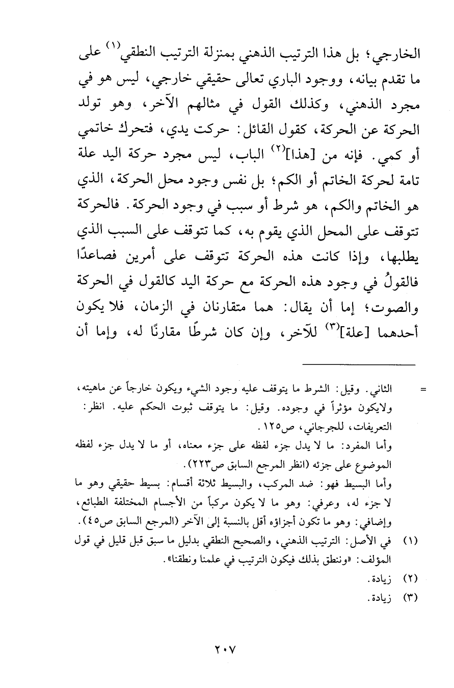 الخارجي بل هذا الترتيب الذهني بمنزلة الترتيب النطقي على ما تقدم بيانه ووجود الباري تعالى حقيقي خارجي ليس هو في مجرد الذهني وكذلك القول في مثالهم الآخر وهو تولد الحركة عن الحركة كقول القائل حركت يدي فتحرك خاتمي أو كمي فإنه من هذا الباب ليس مجرد حركة اليد علة تامة لحركة الخاتم أو الكم بل نفس وجود محل الحركة الذي هو الخاتم والكم هو شرط أو سبب في وجود الحركة فالحركة تتوقف على المحل الذي يقوم به كما تتوقف على السبب الذي يطلبها وإذا كانت هذه الحركة تتوقف على أمرين فصاعدًا فالقولُ في وجود هذه الحركة مع حركة اليد كالقول في الحركة والصوت إما أن يقال هما متقارنان في الزمان فلا يكون أحدهما علة للآخر وإن كان شرطًا مقارنًا له وإما أن