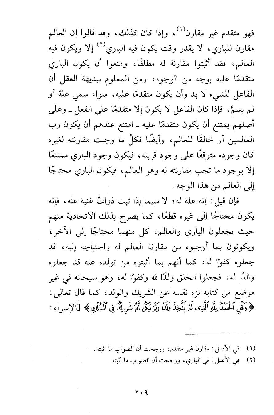 فهو متقدم غير مقارن وإذا كان كذلك وقد قالوا إن العالم مقارن للباري لا يقدر وقت يكون فيه الباري إلا ويكون فيه العالم فقد أثبتوا مقارنة له مطلقًا ومنعوا أن يكون الباري متقدمًا عليه بوجه من الوجوه ومن المعلوم ببديهة العقل أن الفاعل للشيء لا بد وأن يكون متقدمًا عليه سواء سمي علة أو لم يسمَّ فإذا كان الفاعل لا يكون إلا متقدمًا على الفعل وعلى أصلهم يمتنع أن يكون متقدمًا عليه امتنع عندهم أن يكون رب العالمين أو خالقًا للعالم وأيضًا فكلُ ما وجبت مقارنته لغيره كان وجوده متوقفًا على وجود قرينه فيكون وجود الباري ممتنعًا إلا بوجود ما تجب مقارنته له وهو العالم فيكون الباري محتاجًا إلى العالم من هذا الوجه فإن قيل إنه علة له لا سيما إذا ثبت ذواتٌ غنية عنه فإنه يكون محتاجًا إلى غيره قطعًا كما يصرح بذلك الاتحادية منهم حيث يجعلون الباري والعالم كل منهما محتاجًا إلى الآخر ويكونون بما أوجبوه من مقارنة العالم له واحتياجه إليه قد جعلوه كفوًا له كما أنهم بما أثبتوه من تولده عنه قد جعلوه والدًا له فجعلوا الخلق ولدًا لله وكفوًا له وهو سبحانه في غير موضع من كتابه نزه نفسه عن الشريك والولد كما قال تعالى وَقُلِ الْحَمْدُ لِلّهِ الَّذِي لَمْ يَتَّخِذْ وَلَداً وَلَم يَكُن لَّهُ شَرِيكٌ فِي الْمُلْكِ [الإسراء