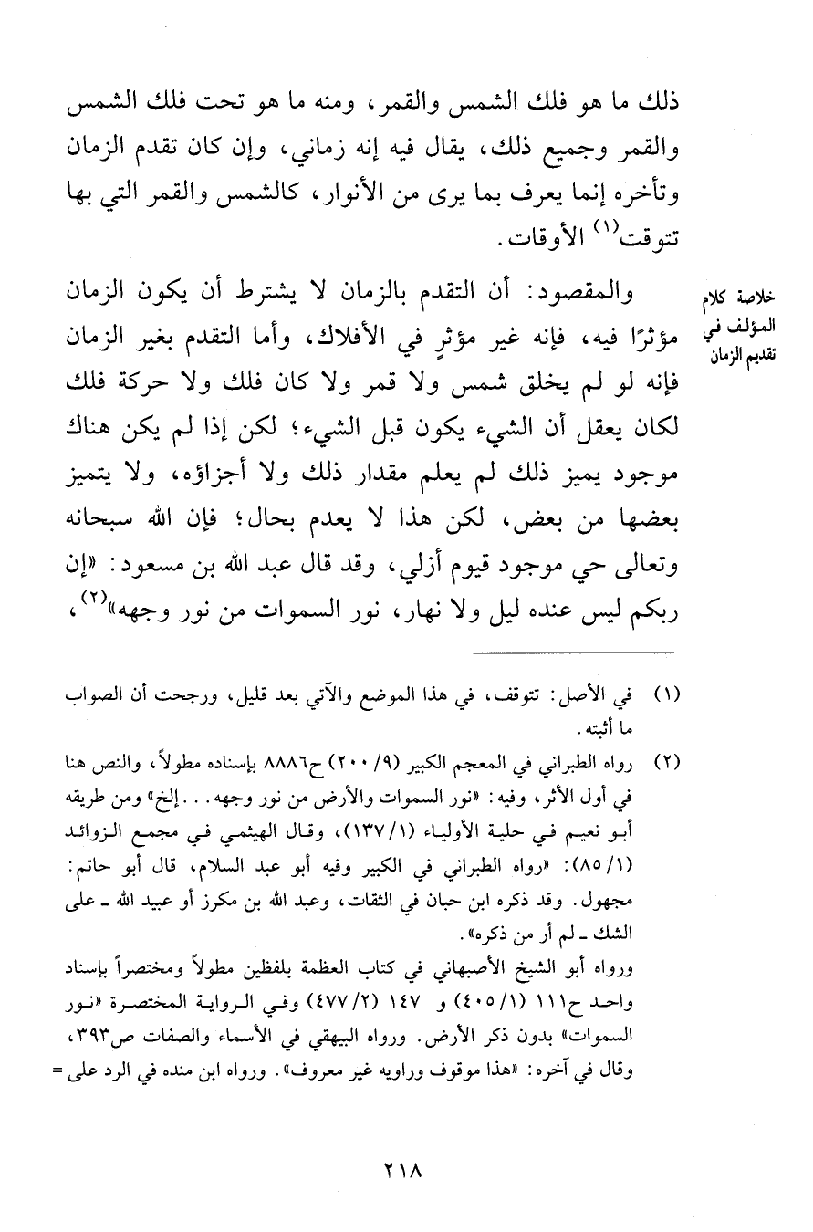 ذلك ما هو فلك الشمس والقمر ومنه ما هو تحت فلك الشمس والقمر وجميع ذلك يقال فيه إنه زماني وإن كان تقدم الزمان وتأخره إنما يعرف بما يرى من الأنوار كالشمس والقمر التي بها تتوقت الأوقات والمقصود أن التقدم بالزمان لا يشترط أن يكون الزمان مؤثرًا فيه فإنه غير مؤثرٍ في الأفلاك وأما التقدم بغير الزمان فإنه لو لم يخلق شمس ولا قمر ولا كان فلك ولا حركة فلك لكان يعقل أن الشيء يكون قبل الشيء لكن إذا لم يكن هناك موجود يميز ذلك لم يعلم مقدار ذلك ولا أجزاؤه ولا يتميز بعضها من بعض لكن هذا لا يعدم بحال فإن الله سبحانه وتعالى حي موجود قيوم أزلي وقد قال عبد الله بن مسعود إن ربكم ليس عنده ليل ولا نهار نور السموات من نور وجهه
