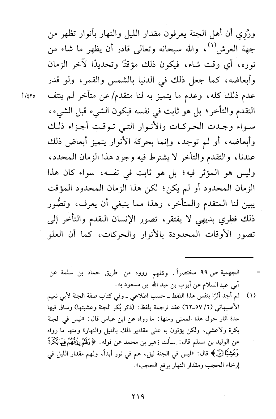 ورُوِي أن أهل الجنة يعرفون مقدار الليل والنهار بأنوار تظهر من جهة العرش والله سبحانه وتعالى قادر أن يظهر ما شاء من نوره أي وقت شاء فيكون ذلك مؤقتًا وتحديدًا لآخر الزمان وأبعاضه كما جعل ذلك في الدنيا بالشمس والقمر ولو قدر عدم ذلك كله وعدم ما يتميز به لنا متقدم عن متأخر لم ينتف التقدم والتأخر بل هو ثابت في نفسه فيكون الشيء قبل الشيء سواء وجدت الحركات والأنوار التي توقت أجزاء ذلك وأبعاضه أو لم توجد وإنما بحركة الأنوار يتميز أبعاض ذلك عندنا والتقدم والتأخر لا يشترط فيه وجود هذا الزمان المحدد وليس هو المؤثر فيه بل هو ثابت في نفسه سواء كان هذا الزمان المحدود أو لم يكن لكن هذا الزمان المحدود المؤقت يبين لنا المتقدم والمتأخر وهذا مما ينبغي أن يعرف وتصُّور ذلك فطري بديهي لا يفتقر تصور الإنسان التقدم والتأخر إلى تصور الأوقات المحددة بالأنوار والحركات كما أن العلو