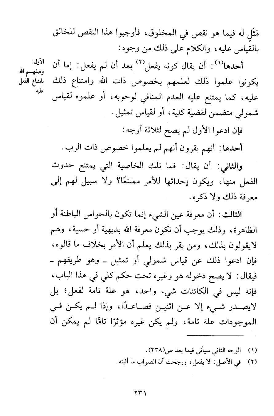 مَثَلٍ له فيما هو نقص في المخلوق فأوجبوا هذا النقص للخالق بالقياس عليه والكلام على ذلك من وجوه أحدها أن يقال كونه يفعل بعد أن لم يفعل إما أن يكونوا علموا ذلك لعلمهم بخصوص ذات الله وامتناع ذلك عليه كما يمتنع عليه العدم المنافي لوجوبه أو علموه لقياس شمولي متضمن لقضية كلية أو لقياس تمثيل فإن ادعوا الأول لم يصح لثلاثة أوجه أحدها أنهم يقرون أنهم لم يعلموا خصوص ذات الرب والثاني أن يقال فما تلك الخاصية التي يمتنع حدوث الفعل منها ويكون إحداثها للأمر ممتنعًا ولا سبيل لهم إلى معرفة ذلك ولا ذكره الثالث أن معرفة عين الشيء إنما تكون بالحواس الباطنة أو الظاهرة وذلك يوجب أن تكون معرفة الله بديهية أو حسية وهم لا يقولون بذلك ومن يقر بذلك يعلم أن الأمر بخلاف ما قالوه فإن ادعوا ذلك عن قياس شمولي أو تمثيل وهو طريقهم فيقال لا يصح دخوله هو وغيره تحت حكم كلي في هذا الباب فإنه ليس في الكائنات شيء واحد هو علة تامة لفعل بل لايصدر شيء إلا عن اثنين فصاعدًا وإذا لم يكن في الموجودات علة تامة ولم يكن غيره مؤثرًا تامًّا لم يمكن أن