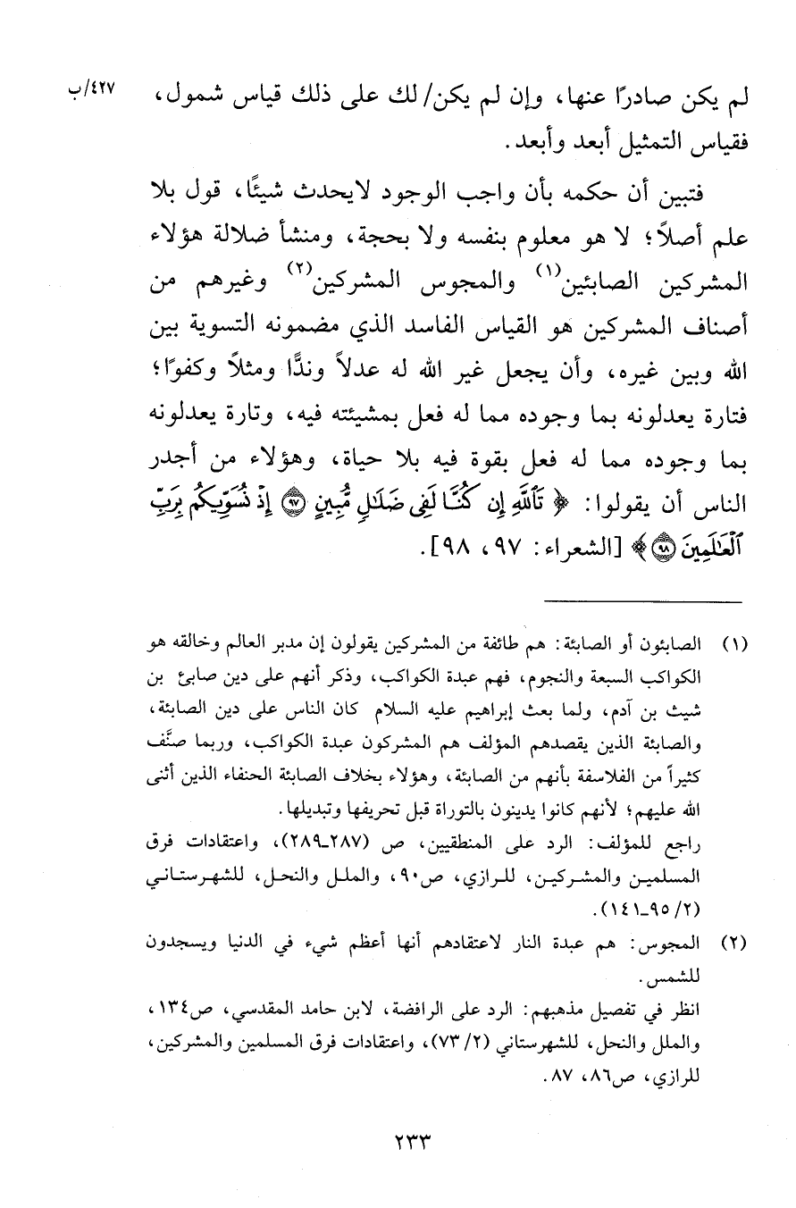 لم يكن صادرًا عنها وإن لم يكن لك على ذلك قياس شمول فقياس التمثيل أبعد وأبعد فتبين أن حكمه بأنه واجب الوجود لا يحدث شيئًا قول بلا علم أصلاً لا هو معلوم بنفسه ولا بحجة ومنشأ ضلالة هؤلاء المشركين الصابئين والمجوس المشركين وغيرهم من أصناف المشركين هو القياس الفاسد الذي مضمونه التسوية بين الله وبين غيره وأن يجعل غير الله عدلاً وندًّا ومثلاً وكفوًا فتارة يعدلونه بما وجوده مما له فعل بمشيئته فيه وتارة يعدلونه بما وجوده مما له فعل بقوة فيه بلا حياة وهؤلاء من أجدر الناس أن يقولوا تَاللَّهِ إِن كُنَّا لَفِي ضَلَالٍ مُّبِينٍ {97} إِذْ نُسَوِّيكُم بِرَبِّ الْعَالَمِينَ {98} [الشعراء 97- 98]