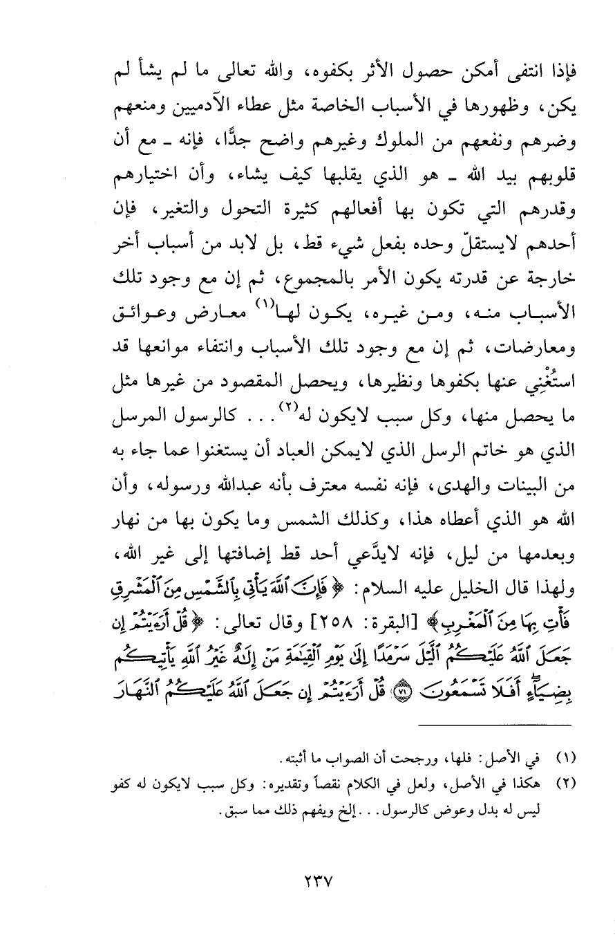 فإذا انتفى أمكن حصول الأثر بكفوه والله تعالى ما لم يشأ لم يكن وظهورها في الأسباب الخاصة مثل عطاء الآدميين ومنعهم وضرهم ونفعهم من الملوك وغيرهم واضح جدًّا فإنه مع أن قلوبهم بيد الله هو الذي يقلبها كيف يشاء وأن اختيارهم وقدرهم التي تكون بها أفعالهم كثيرة التحول والتغير فإن أحدهم لايستقلّ وحده بفعل شيء قط بل لابد من أسباب أخر خارجة عن قدرته يكون الأمر بالمجموع ثم إن مع وجود تلك الأسباب منه ومن غيره يكون لها معارض وعوائق ومعارضات ثم إن مع وجود تلك الأسباب وانتفاء موانعها قد استُغْنِي عنها بكفوها ونظيرها ويحصل المقصود من غيرها مثل ما يحصل منها وكل سبب لايكون له كالرسول المرسل الذي هو خاتم الرسل الذي لايمكن العباد أن يستغنوا عما جاء به من البينات والهدى فإنه نفسه معترف بأنه عبد الله ورسوله وأن الله هو الذي أعطاه هذا وكذلك الشمس وما يكون بها من نهار وبعدمها من ليل فإنه لا يدَّعى أحد قط إضافتها إلى غير الله ولهذا قال الخليل عليه السلام فَإِنَّ اللهَ يَأْتِي بِالشَّمْسِ مِنَ الْمَشْرِقِ فَأْتِ بِهَا مِنَ الْمَغْرِبِ [البقرة 258] وقال تعالى قُلْ أَرَأَيْتُمْ إِن جَعَلَ اللَّهُ عَلَيْكُمُ اللَّيْلَ سَرْمَداً إِلَى يَوْمِ الْقِيَامَةِ مَنْ إِلَهٌ غَيْرُ اللَّهِ يَأْتِيكُم بِضِيَاء أَفَلَا تَسْمَعُونَ {71} قُلْ أَرَأَيْتُمْ إِن جَعَلَ اللَّهُ عَلَيْكُمُ النَّهَارَ