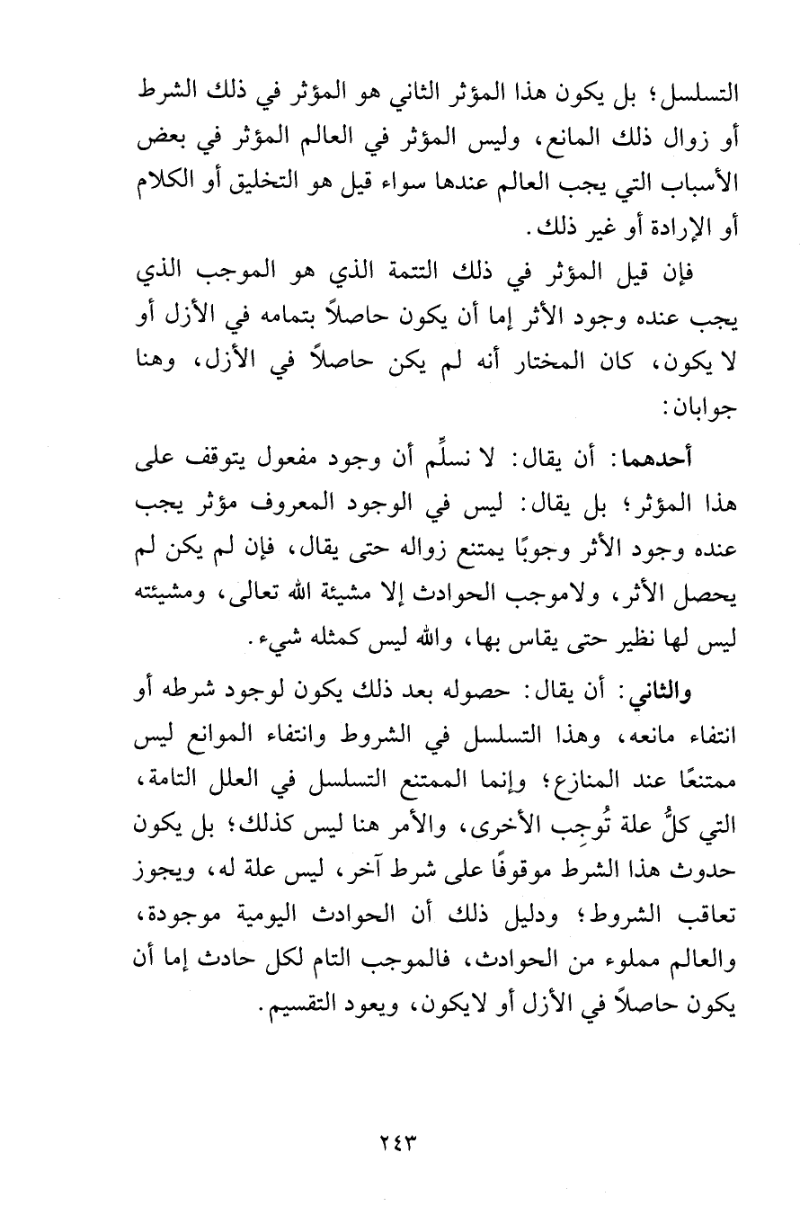 التسلسل بل يكون هذا المؤثر الثاني هو المؤثر في ذلك الشرط أو زوال ذلك المانع وليس المؤثر في العالم المؤثر في بعض الأسباب التي يجب العالم عندها سواء قيل هو التخليق أو الكلام أو الإرادة أو غير ذلك فإن قيل المؤثر في ذلك التتمة الذي هو الموجب الذي يجب عنده وجود الأثر إما أن يكون حاصلاً بتمامه في الأزل أو لا يكون كان المختار أنه لم يزل حاصلاً في الأزل وهنا جوابان أحدهما أن يقال لا نسلِّم أن وجود مفعول يتوقف على هذا المؤثر بل يقال ليس في الوجود المعروف مؤثر يجب عنده وجود الأثر وجوبًا يمتنع زواله حتى يقال فإن لم يكن لم يحصل الأثر ولا موجب الحوادث إلا مشيئة الله تعالى ومشيئته ليس لها نظير حتى يقاس بها والله ليس كمثله شيء والثاني أن يقول حصوله بعد ذلك يكون لوجود شرطه أو انتفاء مانعه وهذا التسلسل في الشروط وانتفاء الموانع ليس ممتنعًا عند المنازع وإنما الممتنع التسلسل في العلل التامة التي كلُّ علة تُوجِب الأخرى والأمر هنا ليس كذلك بل يكون حدوث هذا الشرط موقوفًا على شرط آخر ليس علة له ويجوز تعاقب الشروط ودليل ذلك أن الحوادث اليومية موجودة والعالم مملوء من الحوادث فالموجب التام لكل حادث إما أن يكون حاصلاً في الأزل أو لايكون ويعود التقسيم