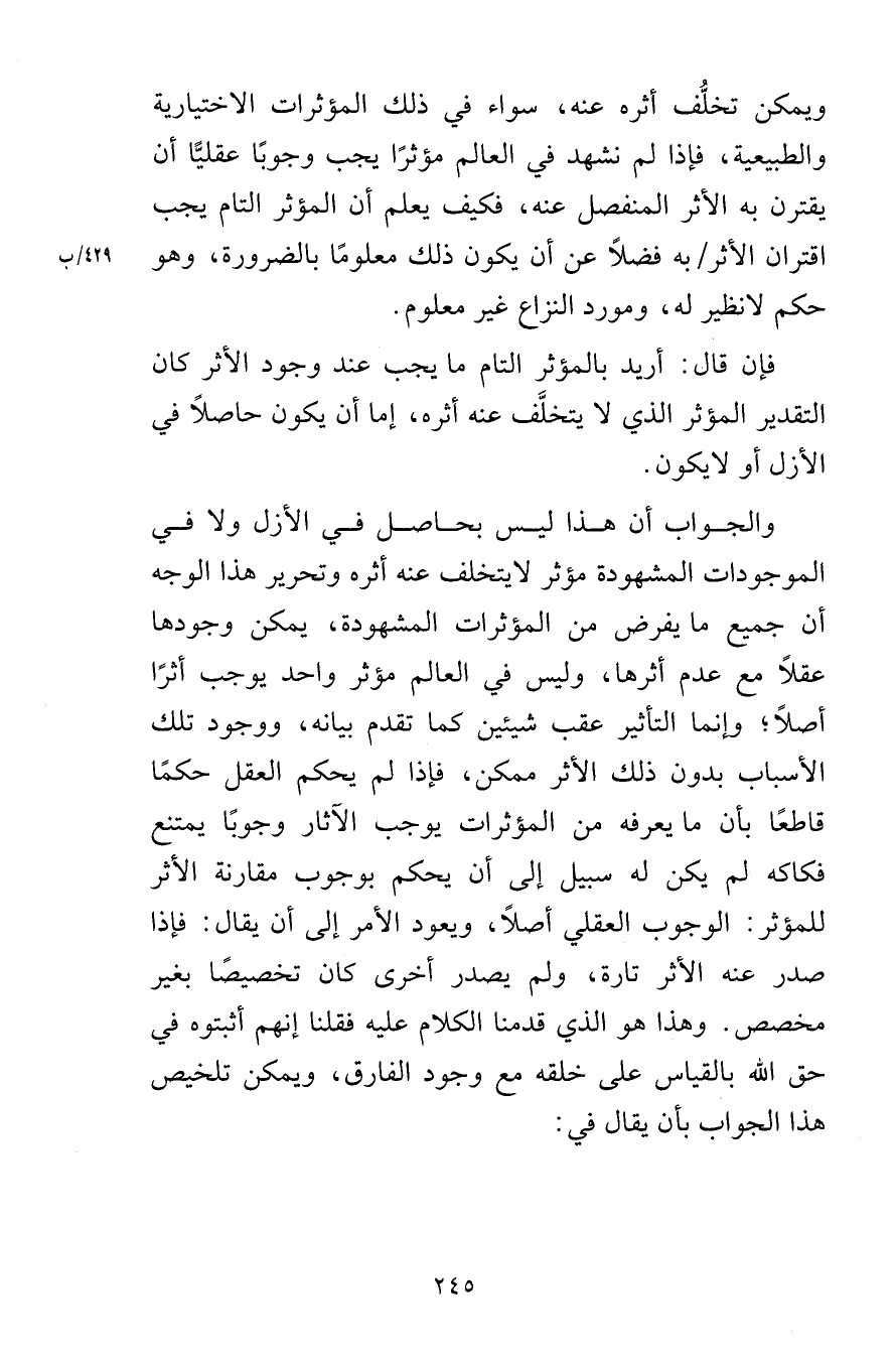 ويمكن تخلُّف أثره عنه سواء في ذلك المؤثرات الاختيارية والطبيعية فإذا لم نشهد في العالم مؤثرًا يجب وجوبًا عقليًّا أن يقترن بعه الأثر المنفصل عنه فكيف يعلم أن المؤثر التام يجب اقتران الأثر به فضلاً عن أن يكون ذلك معلومًا بالضرورة وهو حكم لانظير له ومورد النزاع غير معلوم فإن قال أريد بالمؤثر التام ما يجب عند وجود الأثر كان التقدير المؤثر الذي لا يتخلَّف عنه أثره إما أن يكون حاصلاً في الأزل أو لايكون والجواب أن هذا ليس بحاصل في الأزل ولا في الموجودات المشهودة مؤثر لا يتخلف عنه أثره وتحرير هذا الوجه أن جميع ما يفرض من المؤثرات المشهودة يمكن وجودها عقلاً مع عدم أثرها وليس في العالم مؤثر واحد يوجب أثرًا أصلاً وإنما التأثير عقب شيئين كما تقدم بيانه ووجود تلك الأسباب بدون ذلك الأثر ممكن فإذا لم يحكم العقل حكمًا قاطعًا بأن ما يعرفه من المؤثرات يوجب الآثار وجوبًا يمتنع فكاكه لم يكن له سبيل إلى أن يحكم بوجوب مقارنة الأثر للمؤثر الوجوب العقلي أصلاً ويعود الأمر إلى أن يقال فإذا صدر عنه الأثر تارة ولم يصدر أخرى كان تخصيصًا بغير مخصص وهذا هو الذي قدمنا الكلام عليه فقلنا إنهم أثبتوه في حق الله بالقياس على خلقه مع وجود الفارق ويمكن تلخيص هذا الجواب بأن يقال في