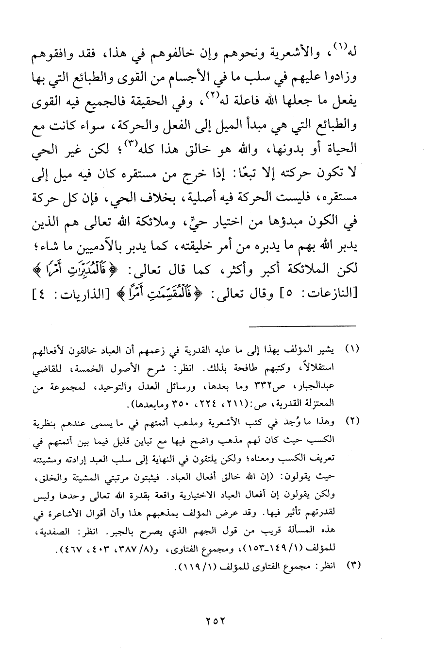 له والأشعرية ونحوهم وإن خالفوهم في هذا فقد وافقوهم وزادوا عليهم في سلب ما في الأجسام من القوى والطبائع التي بها يفعل ما جعلها الله فاعلة له وفي الحقيقة فالجميع فيه القوى والطبائع التي هي مبدأ الميل إلى الفعل والحركة سواء كانت مع الحياة أو بدونها والله هو خالق هذا كله لكن غير الحي لا تكون حركته إلا تبعًا إذا خرج من مستقره كان فيه ميل إلى مستقره فليست الحركة فيه أصلية بخلاف الحي فإن كل حركة في الكون مبدؤها من اختيار حيٍّ وملائكة الله تعالى هم الذين يدبر الله بهم ما يدبره من أمر خليقته كما يدبر بالآدميين ما شاء لكن الملائكة أكبر وأكثر كما قال تعالى فَالْمُدَبِّرَاتِ أَمْراً {5} [النازعات 5] وقال تعالى فَالْمُقَسِّمَاتِ أَمْراً {4} [الذاريات 4]