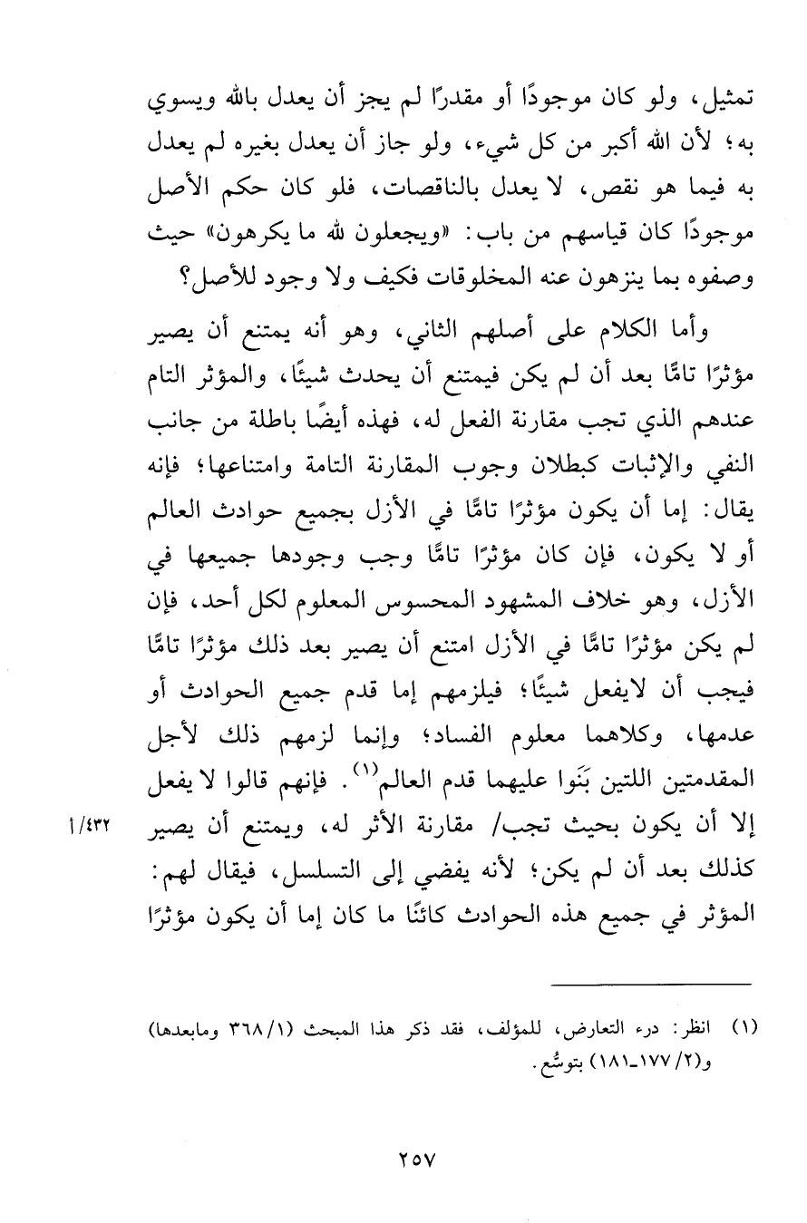 تمثيل ولو كان موجودًا أو مقدرًا لم يجز أن يعدل بالله ويسوي به لأن الله أكبر من كل شيء ولو جاز أن يعدل بغيره لم يعدل به فيما هو نقص لا يعدل بالناقصات فلو كان حكم الأصل موجودًا كان قياسهم من باب ويجعلون لله ما يكرهون حيث وصفوه بما ينزهون عنه المخلوقات فيف ولا وجود للأصل وأما الكلام على أصلهم الثاني وهو انه يمتنع أن يصير مؤثرًا تامًّا بعد أن لم يكن فيمتنع أن يحدث شيئًا والمؤثر التام عندهم الذي تجب مقارنة الفعل له فهذه أيضًا باطلة من جانب النفي والإثبات كبطلان وجوب المقارنة التامة وامتناعها فإنه يقال إما أن يكون مؤثرًا تامًّا في الأزل بجميع حوادث العالم أو لا يكون فإن كان مؤثرًا تامًّا وجب وجودها جميعًا في الأزل وهو خلاف المشهود المحسوس المعلوم لكل أحد فإن لم يكن مؤثرًا تامًّا في الأزل امتنع أن يصير بعد ذلك مؤثرًا تامًّا فيجب أن لايفعل شيئًا فيلزمهم إما قدم جميع الحوادث أو عدمها وكلاهما معلوم الفساد وإنما لزمهم ذلك لأجل المقدمتين اللتين بَنَوا عليهما قدم العالم فإنهم قالوا لا يفعل إلا أن تكون بحيث تجب مقارنة الأثر له ويمتنع أن يصير كذلك بعد أن لم يكن لأنه يفضي إلى التسلسل فيقال لهم المؤثر في جميع هذه الحوادث كائنًا ما كان إما أن يكون مؤثرًا