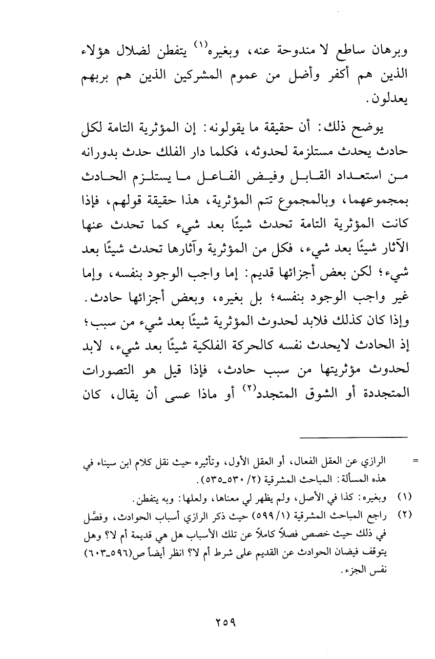 وبرهان ساطع لا مندوحة عنه وبغيره يتفطن لضلال هؤلاء الذين هم أكفر وأضل من عموم المشركين اللذين هم بربهم يعدلون يوضح ذلك أن حقيقة ما يقولونه إن المؤثرية التامة لكل حادث يحدث مستلزمة لحدوثه فكلما دار الفلك حدث بدورانه من استعداد القابل وفيض الفاعل ما يستلزم الحادث بمجموعهما وبالمجموع تتم المؤثرية هذا حقيقة قولهم فإذا كانت المؤثرية التامة تحدث شيئًا بعد شيء كما تحدث عنها الآثار شيئًا بعد شيء فكل من المؤثرية وآثارها تحدث شيئًا بعد شيء لكن بعض أجزائها قديم إما واجب الوجود بنفسه وإما غير واجب الوجود بنفسه بل بغيره وبعض أجزائها حادث وإذا كان كذلك فلابد لحدوث المؤثرية شيئًا بعد شيء من سبب إذ الحادث لايحدث نفسه كالحركة الفلكية شيئًا بعد شيء لابد لحدوث مؤثريتها من سبب حادث فإذا قيل هو التصورات المتجددة أو الشوق المتجدد أو ماذا عسى أن يقال كان