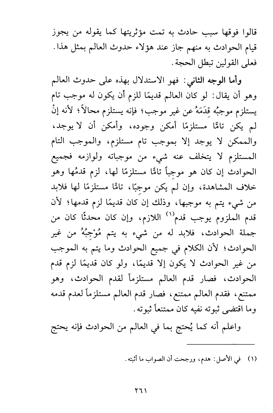 قالوا فوقها سبب حادث به تمت مؤثريتها كما يقوله من يجوز قيام الحوادث به منهم جاز عند هؤلاء حدوث العالم بمثل هذا فعلى القولين تبطل الحجة وأما الوجه الثاني فهو الاستدلال بهذه على حدوث العالم وهو أن يقال لو كان العالم قديمًا للزم أن يكون له موجب تام يستلزم موجبُه قِدَمَهُ عن غير موجب فإنه يستلزم محالاً لأنه إنْ لم يكن تامًّا مستلزمًا أمكن وجوده وأمكن أن لا يوجد والممكن لا يوجد إلا بموجب تام مستلزم والموجب التام المستلزم لا يتخلف عنه شيء من موجباته ولوازمه فجميع الحوادث إن كان هو موجِبًا تامًّا مستلزمًا لها لزم قدمُها وهو خلاف المشاهدة وإن لم يكن موجِبًا تامًّا مستلزمًا لها فلابد من شيء يتم به موجبها وذلك إن كان قديمًا لزم قدمها لأن قدم الملزوم يوجب قدم اللازم وإن كان محدثّا كان من جملة الحوادث فلابد له من شيء به يتم مُوْجِبُهُ من غير الحوادث لأن الكلام في جميع الحوادث وما يتم به الموجب من غير الحوادث لا يكون إلا قديمًا ولو كان قديمًا لزم قدم الحوادث فصار قدم العالم مستلزمًا لقدم الحوادث وهو ممتنع فقدم العالم ممتنع فصار قدم العالم مستلزمًا لعدم قدمه وما اقتضى ثبوت نفيه كان ممتنعاً ثبوته واعلم أنه كما يُحتج بما في العالم من الحوادث فإنه يحتج