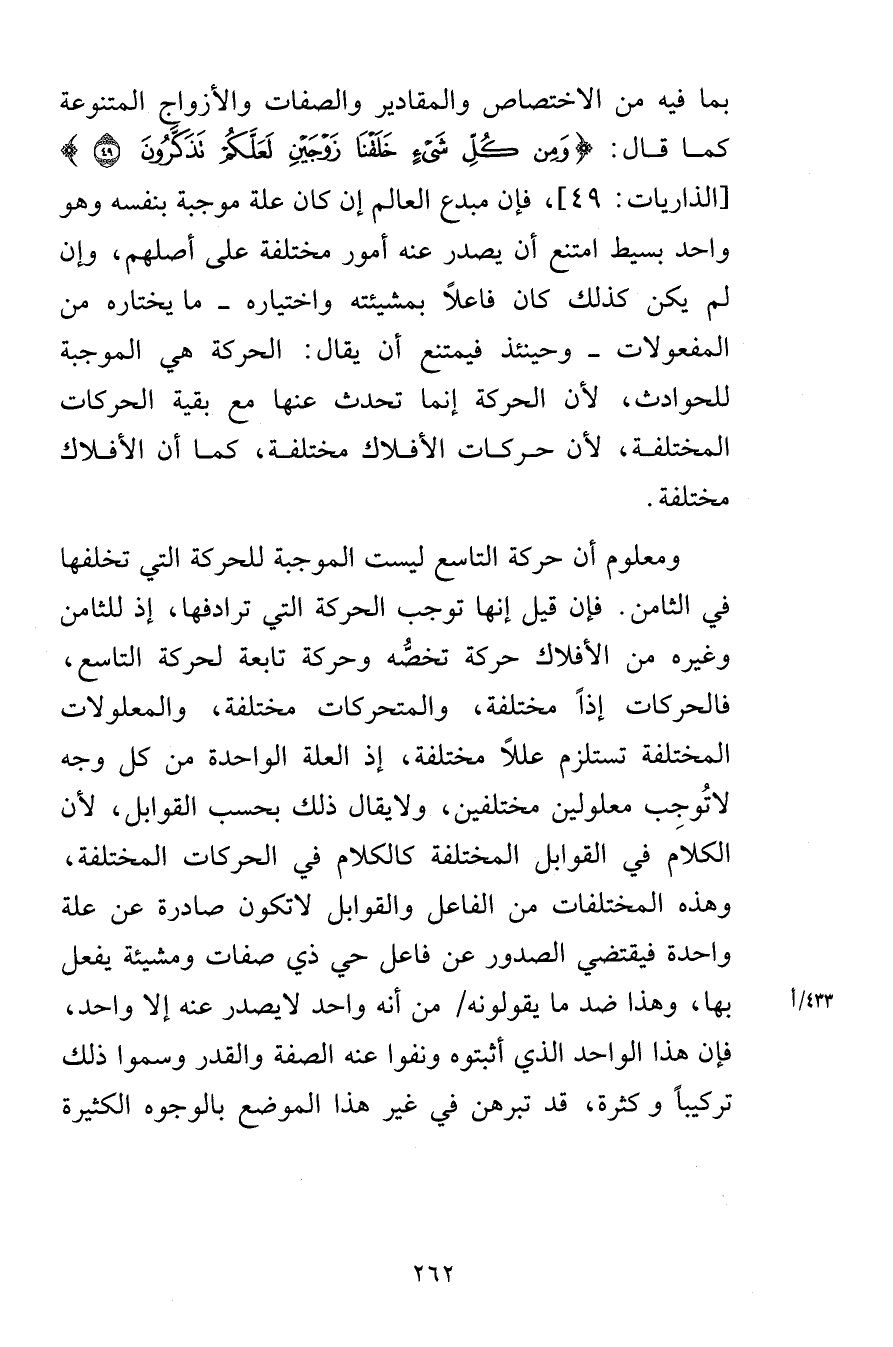 بما فيه من الاختصاص والمقادير والصفات والأزواج المتنوعة كما قال وَمِن كُلِّ شَيْءٍ خَلَقْنَا زَوْجَيْنِ لَعَلَّكُمْ تَذَكَّرُونَ {49} [الذاريات 49] فإن مبدع العالم إن كان علة موجبة بنفسه وهو واحد بسيط امتنع أن يصدر عنه أمور مختلفة على أصلهم وإن لم يكن كذلك كان فاعلاً بمشيئته واختياره ما يختاره من المفعولات وحينئذ فيمتنع أن يقال الحركة هي الموجبة للحوادث لأن الحركة إنما تحدث عنها مع بقية الحركات المختلفة لأن حركات الأفلاك مختلفة كما أن الأفلاك مختلفة ومعلوم أن حركة التاسع ليست الموجبة للحركة التي تخلفها في الثامن فإن قيل إنها توجب الحركة التي ترادفها إذ للثامن وغيره من الأفلاك حركة تخصُّه وحركة تابعة لحركة التاسع فالحركات إذاً مختلفة والمتحركات مختلفة والمعلولات المختلفة تستلزم عللاً مختلفة إذ العلة الواحدة من كل وجه لا تُوجِب معلولين مختلفين ولايقال ذلك بحسب القوابل لأن الكلام في القوابل المختلفة كالكلام في الحركات المختلفة وهذه المختلفات من الفاعل والقوابل لاتكون صادرة عن علة واحدة فيقتضي الصدور عن فاعل حي ذي صفات ومشيئة يفعل بها وهذا ضد ما يقولونه من أنه واحد لايصدر عنه إلا الواحد فإن هذا الواحد الذي أثبتوه ونفوا عنه الصفة والقدر وسموا ذلك تركيباً وكثرة قد تبرهن في غير هذا الموضع بالوجوه الكثيرة