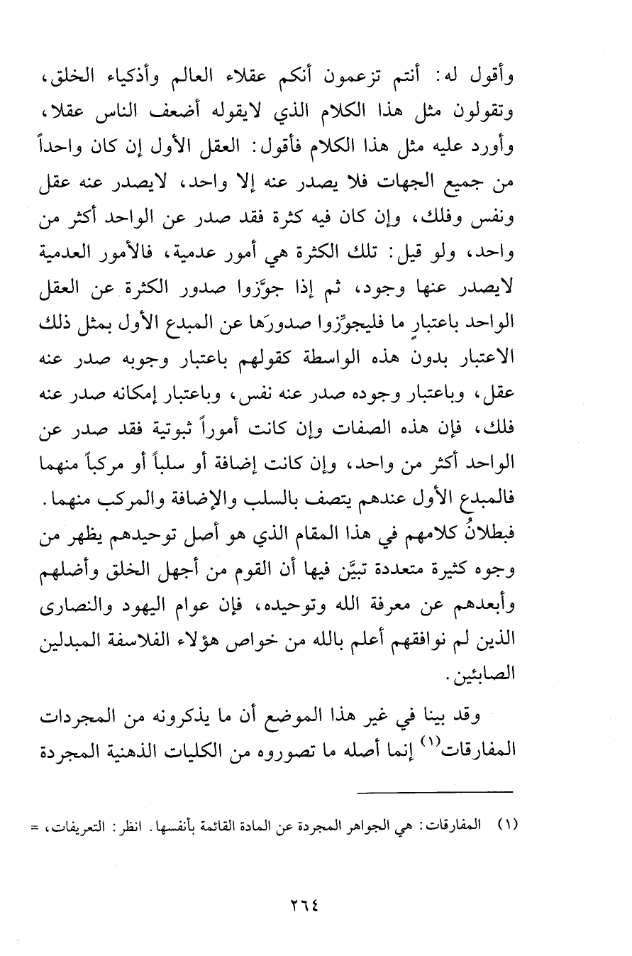 وأقول له أنتم تزعمون أنكم عقلاء العالم وأذكياء الخلق وتقولون مثل هذا الكلام الذي لايقوله أضعف الناس عقلا وأورد عليه مثل هذا الكلام فأقول العقل الأول إن كان واحداً من جميع الجهات فلا يصدر عنه إلا واحد لايصدر عنه عقل ونفس وفلك وإن كان فيه كثرة فقد صدر عن الواحد أكثر من واحد ولو قيل تلك الكثرة هي أمور عدمية فالأمور العدمية لايصدر عنها وجود ثم إذا جوَّزوا صدور الكثرة عن العقل الواحد باعتبارٍ ما فليجوِّزوا صدورَها عن المبدع الأول بمثل ذلك الاعتبار بدون هذه الواسطة كقولهم باعتبار وجوبه صدر عنه عقل وباعتبار وجوده صدر عن نفس وباعتبار إمكانه صدر عنه فلك فإن هذه الصفات وإن كانت أموراً ثبوتية فقد صدر عن الواحد أكثر من واحد وإن كانت إضافة أو سلباً أو مركباً منهما فالمبدع الأول عندهم يتصف بالسلب والإضافة والمركب منهما فبطلانُ كلامهم في هذا المقام الذي هو أصل توحيدهم يظهر من وجوه كثيرة متعددة تبيَّن فيها أن القوم من أجهل الخلق وأضلهم وأبعدهم عن معرفة الله وتوحيده فإن عوام اليهود والنصارى الذين لم نوافقهم أعلم بالله من خواص هؤلاء الفلاسفة المبدلين الصابئين وقد بينا في غير هذا الموضع أن ما يذكرونه من المجردات المفارقات إنما أصله ما تصوروه من الكليات الذهنية المجردة