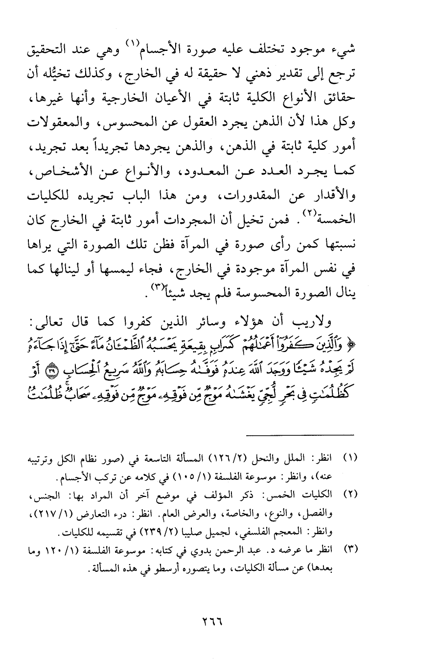 شيء كوجود تختلف عليه صورة الأجسام وهي عند التحقيق ترجع إلى تقدير ذهني لا حقيقة له في الخارج وكذلك تخيُّله أن حقائق الأنواع الكلية ثابتة في الأعيان الخارجية وأنها غيرها وكل هذا لأن الذهن يجرد العقول عن المحسوس والمعقولات أمور كلية ثابتة في الذهن والذهن يجردها تجريداً بعد تجريد كما يجرد العدد عن المعدود والأنواع عن الأشخاص والأقدار عن المقدورات ومن هذا الباب تجريده للكليات الخمسة فمن تخيل أن المجردات أمور ثابتة في الخارج كان نسبتها كمن رأى صورة في المرآة فظن تلك الصورة التي يراها في نفس المرآة موجودة في الخارج فجاء ليمسها أو لينالها كما ينال الصورة المحسوسة فلم يجد شيئاً ولاريب أن هؤلاء وسائر الذين كفروا كما قال تعالى وَالَّذِينَ كَفَرُوا أَعْمَالُهُمْ كَسَرَابٍ بِقِيعَةٍ يَحْسَبُهُ الظَّمْآنُ مَاء حَتَّى إِذَا جَاءهُ لَمْ يَجِدْهُ شَيْئاً وَوَجَدَ اللَّهَ عِندَهُ فَوَفَّاهُ حِسَابَهُ وَاللَّهُ سَرِيعُ الْحِسَابِ {39} أَوْ كَظُلُمَاتٍ فِي بَحْرٍ لُّجِّيٍّ يَغْشَاهُ مَوْجٌ مِّن فَوْقِهِ مَوْجٌ مِّن فَوْقِهِ سَحَابٌ ظُلُمَاتٌ
