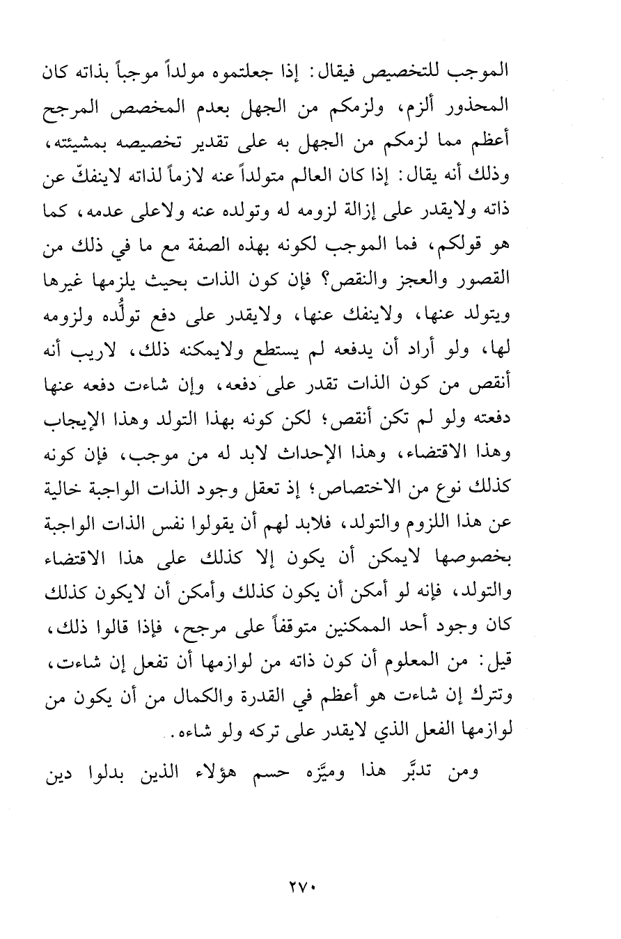 الموجب للتخصيص فيقال إذا جعلتموه مولداً موجباً بذاته كان المحذور ألزم ولزمكم من الجهل بعدم المخصص المرجح أعظم مما لزمكم من الجهل به على تقدير تخصيصه بمشيئته وذلك أنه يقال إذا كان العالم متولداً عنه لازماً لذاته لا ينفكّ عن ذاته ولايقدر على إزالة لزومه له وتولده عنه ولاعلى عدمه كما هو قولكم فما الموجب لكونه بهذه الصفة مع ما في ذلك من القصور والعجز والنقص فإن كون الذات بحيث يلزمها غيرها ويتولد عنها ولاينفك عنها ولايقدر على دفع تولُّده ولزومه لها ولو أراد أن يدفعه لم يستطع ولا يمكنه ذلك لاريب أنه أنقص من كون الذات تقدر على دفعه وإن شاءت دفعه عنها دفعته ولو لم تكن أنقص لكن كونه بهذا التولد وهذا الإيجاب وهذا الاقتضاء وهذا الإحداث لابد له من موجب فإن كونه كذلك نوع من الاختصاص إذ تعقل وجود الذات الواجبة خالية عن هذا اللزوم والتولد فلابد لهم أن يقولوا نفس الذات الواجبة بخصوصها لايمكن أن يكون إلا كذلك على هذا الاقتضاء والتولد فإنه لو أمكن أن يكون كذلك وأمكن أن لايكون كذلك كان وجود أحد الممكنين متوقفاً على مرجح فإذا قالوا ذلك قيل من المعلوم أن كون ذاته من لوازمها أن تفعل إن شاءت وتترك إن شاءت هو أعظم في القدرة والكمال من أن يكون من لوازمها الفعل الذي لايقدر على تركه ولو شاءه ومن تدبَّر هذا وميَّزه حسم هؤلاء الذين بدلوا دين