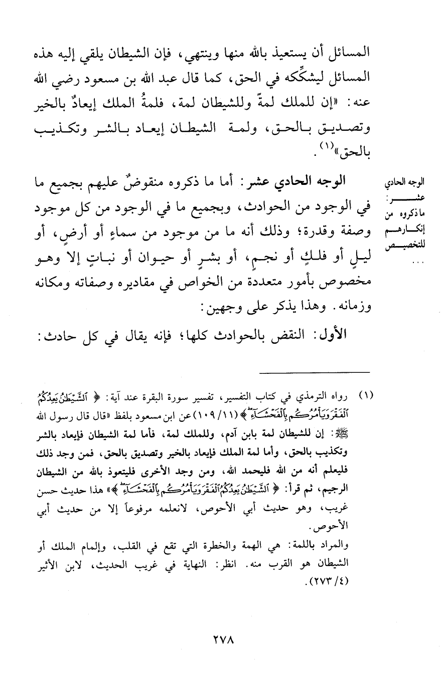 المسائل أن يستعيذ بالله منها وينتهي فإن الشيطان يلقي إليه هذه المسائل ليشكِّكه في الحق كما قال عبد الله بن مسعود رضي الله عنه إن للملك لمةً وللشيطان لمة فلمةُ الملك إيعادٌ بالخير وتصديق بالحق ولمة الشيطان إيعاد بالشر وتكذيب بالحق الوجه الحادي عشر أما ما ذكروه منقوضٌ عليه بجميع ما في الوجوه من الحوادث وبجميع ما في الوجود من كل موجود وصفة وقدرة وذلك أنه ما من موجود من سماءٍ أو أرضٍ أو ليلٍ أو فلكٍ أو نجمٍ أو بشرٍ أو حيوان أو نباتٍ إلا وهو مخصوص بأمور متعددة من الخواص في مقاديره وصفاته ومكانه وزمانه وهذا يذكر على وجهين الأول النقض بالحوادث كلها فإنه يقال في كل حادث