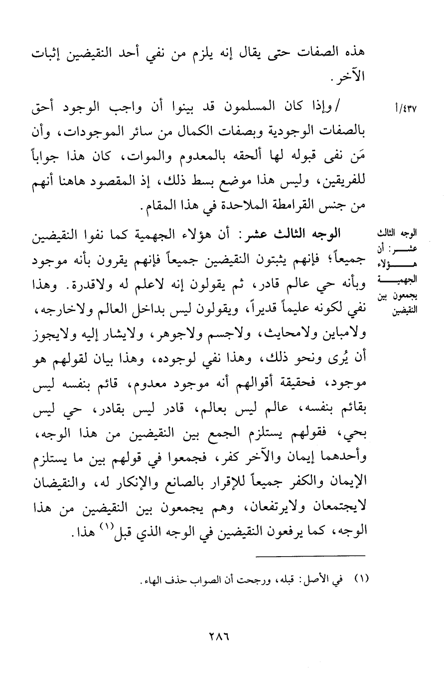 هذه الصفات حتى يقال إنه يلزم من نفي أحد النقيضين إثبات الآخر وإذا كان المسلمون قد بينوا أن واجب الوجود أحق بالصفات الوجودية وبصفات الكمال من سائر الموجودات وأن مَن نفى قبوله لها ألحقه بالمعدوم والموات كان هذا جواباً للفريقين وليس هذا موضع بسط ذلك إذ المقصود هاهنا أنهم من جنس القرامطة الملاحدة في هذا المقام الوجه الثالث عشر أن هؤلاء الجهمية كما نفوا النقيضين جميعاً فإنهم يثبتون النقيضين جميعاً فإنهم يقرون بأنه موجود وبأنه حي عالم قادر ثم يقولون إنه لاعلم له ولاقدرة وهذا نفي لكونه عليماً قديراً ويقولون ليس بداخل العالم ولاخارجه ولامباين ولامحايث ولاجسم ولاجوهر ولايشار إليه ولايجوز أن يُرى ونحو ذلك وهذا نفي لوجوده وهذا بيان لقولهم هو موجود فحقيقة أقوالهم أنه موجود معدوم قائم بنفسه ليس بقائم بنفسه عالم ليس بعالم قادر ليس بقادر حي ليس بحي فقولهم يستلزم الجمع بين النقيضين من هذا الوجه وأحدهما إيمان والآخر كفر فجمعوا في قولهم بين ما يستلزم الإيمان والكفر جميعاً للإقرار بالصانع والإنكار له والنقيضان لايجتمعان ولايرتفعان وهم يجمعون بين النقيضين من هذا الوجه كما يرفعون النقيضين في الوجه الذي قبل هذا