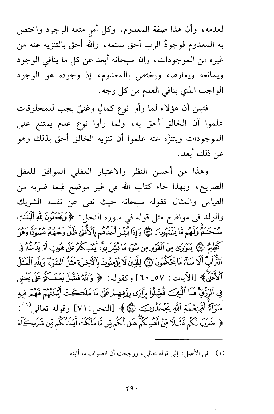 لعدمه وأن هذه صفة المعدوم وكل أمرٍ منه الوجود واختص به المعدوم فوجودُ الرب أحق بمنعه والله أحق بالتنزيه عنه من غيره من الموجودات والله سبحانه ابعد عن كل ما ينافي الوجود ويمانعه ويعارضه ويختص بالمعدوم إذ وجوده هو الوجود الواجب الذي ينافي العدم من كل وجه فتبين أن هؤلاء لما رأوا نوع كمالٍ وغنىً يجب للمخلوقات علموا أن الخالق أحق به ولما رأوا نوع عدم يمتنع على الموجودات ويتنزَّه عنه علموا أن تنزيه الخالق أحق بذلك وهو عن ذلك أبعد وهذا من أحسن النظر والاعتبار العقلي الموافق للعقل الصريح وبهذا جاء كتاب الله في غير موضع فيما ضربه من القياس والمثال كقوله سبحانه حيث نفى عن نفسه الشريك والولد في مواضع مثل قوله في سورة النحل وَيَجْعَلُونَ لِلَّهِ الْبَنَاتِ سُبْحَانَهُ وَلَهُمْ مَا يَشْتَهُونَ (57) وَإِذَا بُشِّرَ أَحَدُهُمْ بِالْأُنْثَى ظَلَّ وَجْهُهُ مُسْوَدًّا وَهُوَ كَظِيمٌ (58) يَتَوَارَى مِنَ الْقَوْمِ مِنْ سُوءِ مَا بُشِّرَ بِهِ أَيُمْسِكُهُ عَلَى هُونٍ أَمْ يَدُسُّهُ فِي التُّرَابِ أَلَا سَاءَ مَا يَحْكُمُونَ (59) لِلَّذِينَ لَا يُؤْمِنُونَ بِالْآخِرَةِ مَثَلُ السَّوْءِ وَلِلَّهِ الْمَثَلُ الْأَعْلَى [الآيات 57-60] وكقوله وَاللَّهُ فَضَّلَ بَعْضَكُمْ عَلَى بَعْضٍ فِي الرِّزْقِ فَمَا الَّذِينَ فُضِّلُوا بِرَادِّي رِزْقِهِمْ عَلَى مَا مَلَكَتْ أَيْمَانُهُمْ فَهُمْ فِيهِ سَوَاءٌ أَفَبِنِعْمَةِ اللَّهِ يَجْحَدُونَ (71) [النحل 71] وقوله تعالى ضَرَبَ لَكُمْ مَثَلًا مِنْ أَنْفُسِكُمْ هَلْ لَكُمْ مِنْ مَا مَلَكَتْ أَيْمَانُكُمْ مِنْ شُرَكَاءَ