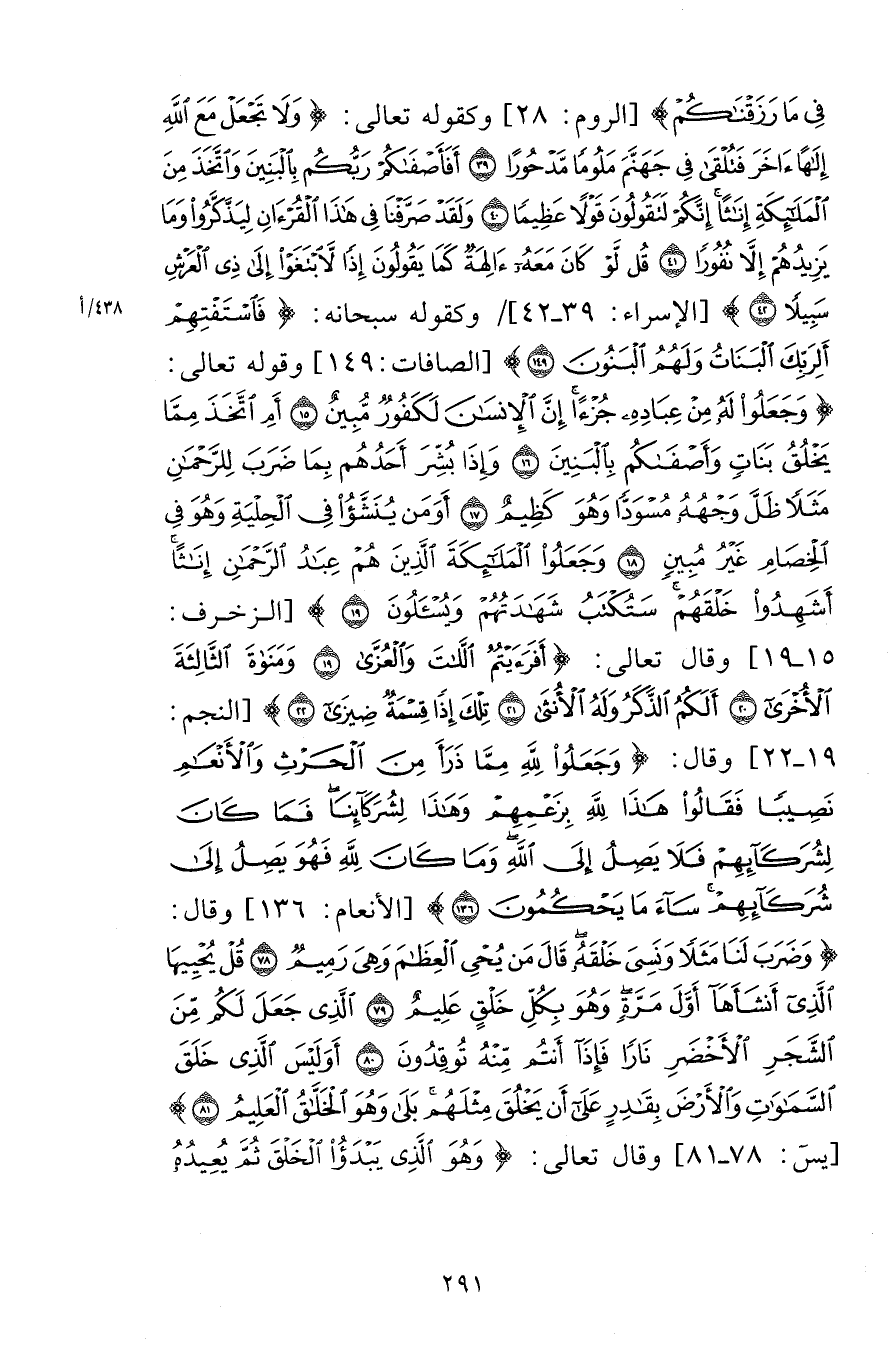 فِي مَا رَزَقْنَاكُمْ [الروم 28] وكقوله تعالى وَلَا تَجْعَلْ مَعَ اللَّهِ إِلَهًا آخَرَ فَتُلْقَى فِي جَهَنَّمَ مَلُومًا مَدْحُورًا (39) أَفَأَصْفَاكُمْ رَبُّكُمْ بِالْبَنِينَ وَاتَّخَذَ مِنَ الْمَلَائِكَةِ إِنَاثًا إِنَّكُمْ لَتَقُولُونَ قَوْلًا عَظِيمًا (40) وَلَقَدْ صَرَّفْنَا فِي هَذَا الْقُرْآنِ لِيَذَّكَّرُوا وَمَا يَزِيدُهُمْ إِلَّا نُفُورًا (41) قُلْ لَوْ كَانَ مَعَهُ آلِهَةٌ كَمَا يَقُولُونَ إِذًا لَابْتَغَوْا إِلَى ذِي الْعَرْشِ سَبِيلًا (42) [الإسراء 39-42] وكقوله سبحانه فَاسْتَفْتِهِمْ أَلِرَبِّكَ الْبَنَاتُ وَلَهُمُ الْبَنُونَ (149) [الصافات 149] وقوله تعالى وَجَعَلُوا لَهُ مِنْ عِبَادِهِ جُزْءًا إِنَّ الْإِنْسَانَ لَكَفُورٌ مُبِينٌ (15) أَمِ اتَّخَذَ مِمَّا يَخْلُقُ بَنَاتٍ وَأَصْفَاكُمْ بِالْبَنِينَ (16) وَإِذَا بُشِّرَ أَحَدُهُمْ بِمَا ضَرَبَ لِلرَّحْمَنِ مَثَلًا ظَلَّ وَجْهُهُ مُسْوَدًّا وَهُوَ كَظِيمٌ (17) أَوَمَنْ يُنَشَّأُ فِي الْحِلْيَةِ وَهُوَ فِي الْخِصَامِ غَيْرُ مُبِينٍ (18) وَجَعَلُوا الْمَلَائِكَةَ الَّذِينَ هُمْ عِبَادُ الرَّحْمَنِ إِنَاثًا أَشَهِدُوا خَلْقَهُمْ سَتُكْتَبُ شَهَادَتُهُمْ وَيُسْأَلُونَ (19) [الزخرف 15-19] وقال تعالى أَفَرَأَيْتُمُ اللَّاتَ وَالْعُزَّى (19) وَمَنَاةَ الثَّالِثَةَ الْأُخْرَى (20) أَلَكُمُ الذَّكَرُ وَلَهُ الْأُنْثَى (21) تِلْكَ إِذًا قِسْمَةٌ ضِيزَى (22) [النجم 19-22] وقال وَجَعَلُوا لِلَّهِ مِمَّا ذَرَأَ مِنَ الْحَرْثِ وَالْأَنْعَامِ نَصِيبًا فَقَالُوا هَذَا لِلَّهِ بِزَعْمِهِمْ وَهَذَا لِشُرَكَائِنَا فَمَا كَانَ لِشُرَكَائِهِمْ فَلَا يَصِلُ إِلَى اللَّهِ وَمَا كَانَ لِلَّهِ فَهُوَ يَصِلُ إِلَى شُرَكَائِهِمْ سَاءَ مَا يَحْكُمُونَ (136) [الأنعام 136] وقال وَضَرَبَ لَنَا مَثَلًا وَنَسِيَ خَلْقَهُ قَالَ مَنْ يُحْيِ الْعِظَامَ وَهِيَ رَمِيمٌ (78) قُلْ يُحْيِيهَا الَّذِي أَنْشَأَهَا أَوَّلَ مَرَّةٍ وَهُوَ بِكُلِّ خَلْقٍ عَلِيمٌ (79) الَّذِي جَعَلَ لَكُمْ مِنَ الشَّجَرِ الْأَخْضَرِ نَارًا فَإِذَا أَنْتُمْ مِنْهُ تُوقِدُونَ (80) أَوَلَيْسَ الَّذِي خَلَقَ السَّمَاوَاتِ وَالْأَرْضَ بِقَادِرٍ عَلَى أَنْ يَخْلُقَ مِثْلَهُمْ بَلَى وَهُوَ الْخَلَّاقُ الْعَلِيمُ (81) [يس 78-81] وقال تعالى وَهُوَ الَّذِي يَبْدَأُ الْخَلْقَ ثُمَّ يُعِيدُهُ