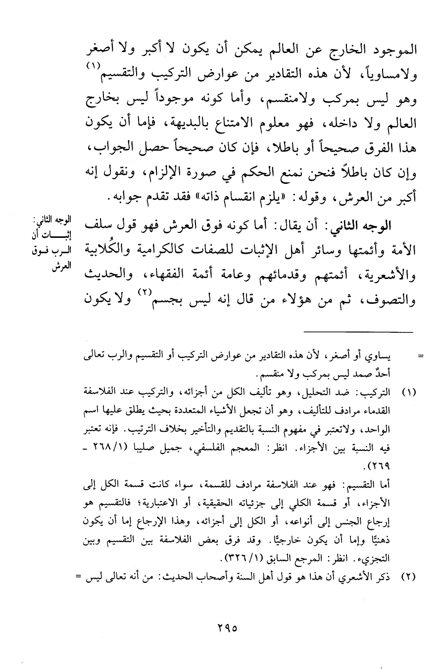 الموجود الخارج عن العالم يمكن أن يكون لا أكبر ولا أصغر ولا مساوياً لأن هذه التقادير من عوارض التركيب والتقسيم وهو ليس بمركب ولامنقسم وأما كونه موجوداً لا بخارج العالم ولا داخله فهو معلوم الامتناع بالبديهة فإما أن يكون هذا الفرق صحيحاً أو باطلا فإن كان صحيحاً حصل الجواب وإن كان باطلاً فنحن نمنع الحكم في صورة الإلزام ونقول إنه أكبر من العرش وقوله يلزم انقسام ذاته فقد تقدم جوابه الوجه الثاني أن يقال أما كونه فوق العرش فهو قول سلف الأمة وأئمتها وسائر أهل الإثبات للصفات كالكرامية والكُلابية والشعرية وأئمتهم وقدمائهم وعامة أئمة الفقهاء والحديث والتصوف ثم من هؤلاء من قال إنه ليس بجسم ولا يكون