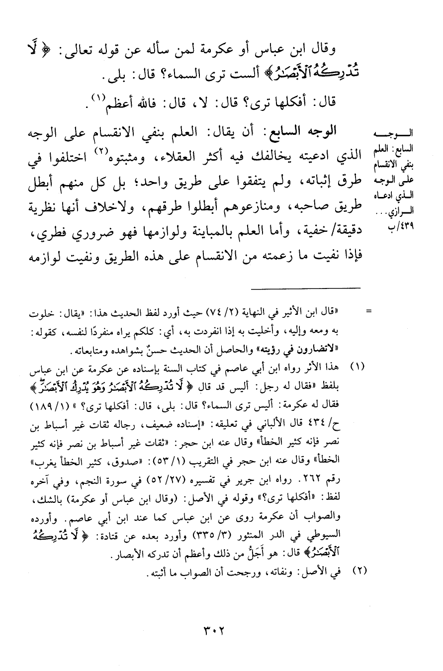 وقال ابن عباس أو عكرمة لمن سأله عن قوله تعالى لَا تُدْرِكُهُ الْأَبْصَارُ ألست ترى السماء قال بلى قال أفكلها ترى قال لا قال قال فالله أعظم الوجه السابع أن يقال العلم بنفي الانقسام على الوجه الذي ادعيته يخالفك فيه أكثر العقلاء ومثبتوه واختلفوا في طرق إثباته ولم يتفقوا على طريق واحد بل كل منهم أبطل طريق صاحبه ومنازعوهم أبطلوا طرقهم ولاخلاف أنها نظرية دقيقة خفية وأما العلم بالمباينة ولوازمها فهو ضروري فطري فإذا نفيت ما زعمته من الانقسام على هذه الطريق ونفيت لوازمه