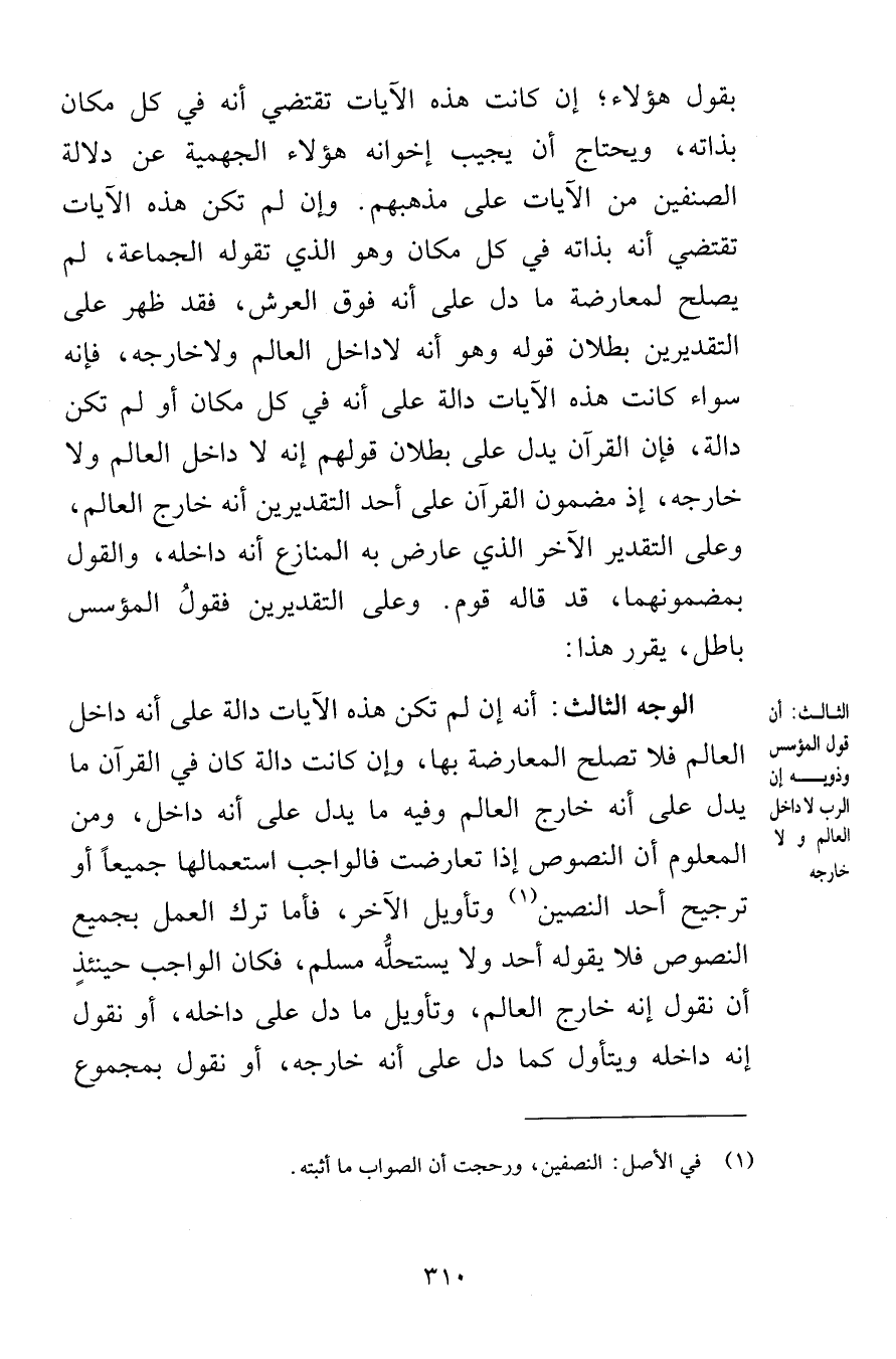 بقول هؤلاء إن كانت هذه الآيات تقتضي أنه في كل مكان بذاته ويحتاج أن يجيب إخوانه هؤلاء الجهمية عن دلالة الصنفين من الآيات على مذهبهم وإن لم تكن هذه الآيات تقتضي أنه بذاته في كل مكان وهو الذي تقوله الجماعة لم يصلح لمعارضة ما دل على أنه فوق العرش فقد ظهر على التقديرين بطلان قوله وهو أنه لاداخل العالم ولاخارجه فإنه سواء كانت هذه الآيات دالة على أنه في كل مكان أو لم تكن دالة فإن القرآن يدل على بطلان قولهم إنه لا داخل العالم ولا خارجه إذ مضمون القرآن على أحد التقديرين أنه خارج العالم وعلى التقدير الآخر الذي عارض به المنازع أنه داخله والقول بمضمونها قد قاله القوم وعلى التقديرين فقولُ المؤسس باطل يقرر هذا الوجه الثالث أنه إن لم تكن هذه الآيات دالة على أنه داخل العالم فلا تصلح المعارضة بها وإن كانت دالة كان في القرآن ما يدل على أنه خارج العالم وفيه ما يدل على انه داخل ومن المعلوم أن النصوص إذا تعارضت فالواجب استعمالها جميعاً أو ترجيح أحد النصين وتأويل الآخر فأما ترك العمل بجميع النصوص فلا يقوله أحد ولا يستحلُّه مسلم فكان الواجب حينئذٍ أن نقول إنه خارج العالم وتأويل ما دل على داخله أو نقول إنه داخله ويتأول كما دل على أنه خارجه أو نقول بمجموع