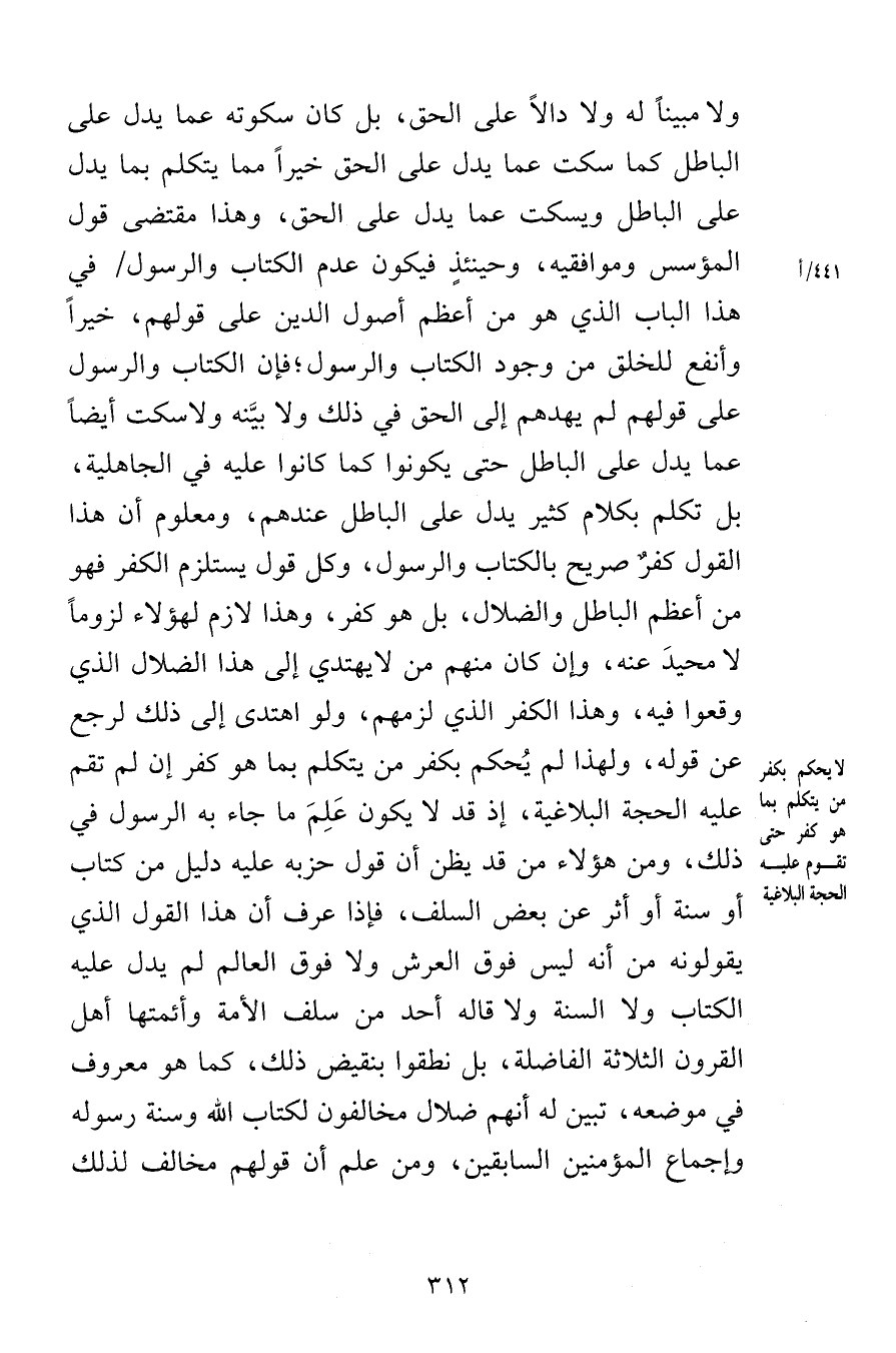 ولا مبيناً له ولا دالاً على الحق بل كان سكوته عما يدل على الباطل كما سكت عما يدل على الحق خيراً مما يتكلم بما يدل على الباطل ويسكت عما يدل على الحق وهذا مقتضى قول المؤسس وموافقيه وحينئذٍ يكون عدم الكتاب والرسول في هذا الباب الذي هو من أعظم أصول الدين على قولهم خيراً وأنفع للخلق من وجود الكتاب والرسول فإن الكتاب والرسول على قولهم لم يهدهم إلى الحق في ذلك ولا بيَّنه ولا سكت أيضاً عما يدل على الباطل حتى يكونوا كما كانوا عليه في الجاهلية بل تكلم بكلام كثير يدل على الباطل عندهم ومعلوم أن هذا القول كفرٌ بصريح الكتاب والرسول وكل قول يستلزم الكفر فهو من أعظم الباطل والضلال بل هو كفر وهذا لازم لهؤلاء لزوماً لا محيدَ عنه وإن كان منهم من لايهتدي إلى هذا الضلال الذي وقعوا فيه وهذا الكفر الذي لزمهم ولو اهتدى إلى ذلك لرجع عن قوله ولهذا لم يُحكم بكفر من يتكلم بنا هو كفر إن لم تقم عليه الحجة البلاغية إذ قد لا يكون عَلِمَ ما جاء به الرسول في ذلك ومن هؤلاء من قد يظن أن قوله حزبه عليه دليل من كتاب أو سنة أو أثر عن بعض السلف فإذا عرف أن هذا القول الذي يقولونه من أنه ليس فوق العرش ولا فوق العالم لم يدل عليه الكتاب ولا السنة ولا قاله أحد من سلف الأمة وأئمتها أهل القرون الثلاثة الفاضلة بل نطقوا بنقيض ذلك كما هو معروف في موضعه تبين لهم أنهم ضلال مخالفون لكتاب الله وسنة رسوله وإجماع المؤمنين السابقين ومن علم أن قولهم مخالف لذلك