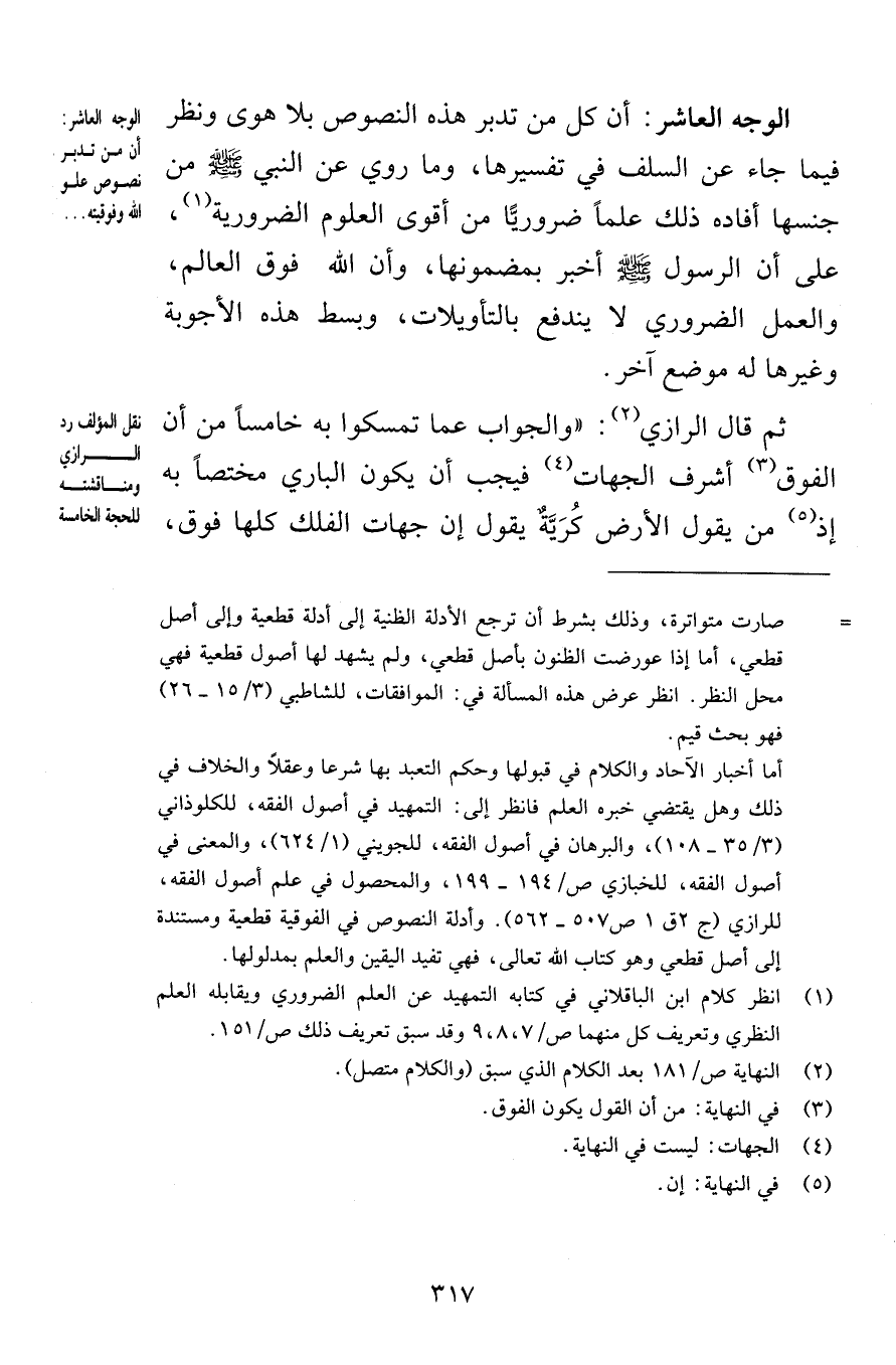 الوجه العاشر أن كل من تدبر هذه النصوص بلا هوى ونظر فيما جاء عن السلف في تفسيرها وما روي عن النبي صلى الله عليه وسلم من جنسها أفاده ذلك علماً ضروريًّا من أقوى العلوم الضرورية على أن الرسول صلى الله عليه وسلم أخبر بمضمونها وأن الله فوق العالم والعمل الضروري لا يندفع بالتأويلات وبسط هذه الأجوبة وغيرها له موضع آخر ثم قال الرازي والجواب عما تمسكوا به خامساً من أن الفوق أشرف الجهات فيجب أن يكون الباري مختصاً به إذ من يقول الأرض كُرَيَّةٌ يقول إن جهات الفلك كلها فوق