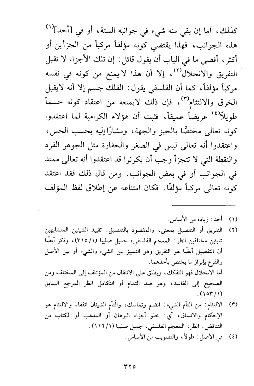 كذلك أما إن بقي منه شيء في جوانبه الستة أو في أحد هذه الجوانب فهذا يقتضي كونه مؤلفاً مركباً من الجزأين أو أكثر أقصى ما في الباب أن يقول قائل إن تلك الأجزاء لا تقبل التفريق والانحلال إلا أن هذا لا يمنع من كونه في نفسه مركباً مؤلفاً كما أن الفلسفي يقول الفلك جسم إلا أنه لايقبل الخرق والالتئام فإن ذلك لايمنعه من اعتقاد كونه جسماً طويلاً عريضاً عميقاً فثبت أن هؤلاء الكرامية لما اعتقدوا كونه تعالى مختصًّا بالحيز والجهة ومشارًا إليه بحسب الحس واعتقدوا أنه تعالى ليس في الصغر والحقارة مثل الجوهر الفرد والنقطة التي لا تتجزأ وجب أن يكونوا قد اعتقدوا أنه تعالى ممتد في الجوانب أو في بعض الجوانب ومن قال ذلك فقد اعتقد كونه تعالى مركباً مؤلفًا فكان امتناعه عن إطلاق لفظ المؤلف