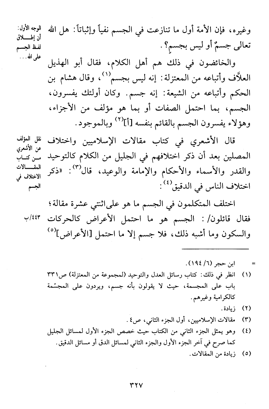 وغيره فإن الأمة أول ما تنازعت في الجسم نفياً وإثباتاً هل الله تعالى بجسمٌ أو ليس بجسمٍ والخائضون في ذلك هم أهل الكلام فقال أبو الهذيل العلاَّف وأتباعه من المعتزلة إنه ليس بجسم وقال هشام بن الحكم وأتباعه من الشيعة أنه جسم وكان أولئك يفسرون الجسم بما احتمل الصفات أو ربما هو مؤلف من الأجزاء وهؤلاء يفسرون الجسم بالقائم بنفسه أوبالموجود قال الأشعري في كتاب مقالات الإسلاميين واختلاف المصلين بعد أن ذكر اختلافهم في الجليل من الكلام والتوحيد والقدر والأسماء والأحكام والإمامة والوعيد قال ذكر اختلاف الناس في الدقيق اختلف المتكلمون في الجسم ما هو على اثنتي عشرة مقالة فقال قائلون الجسم هو ما احتمل الأعراض كالحركات والسكون وما أشبه ذلك فلا جسم إلا ما احتمل الأعراض