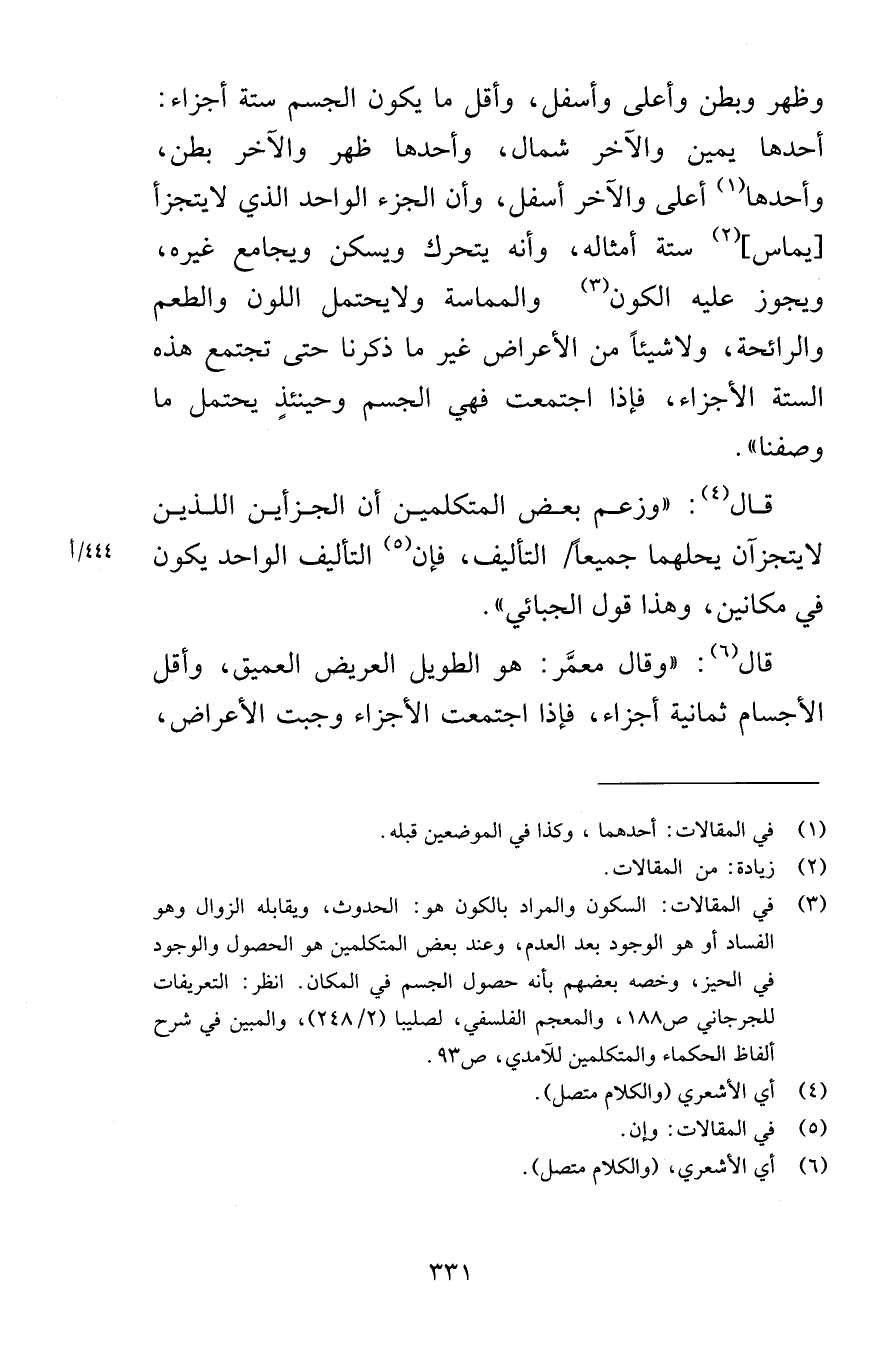 وظهر وبطن وأعلى وأسفل وأقل ما يكون الجسم ستة أجزاء أحدها يمين والآخر شمال أحدها ظهر والآخر بطن وأحدها أعلى والآخر أسفل وأن الجزء الواحد الذي لايتجزأ يماس ستة أمثاله وأنه يتحرك ويسكن ويجامع غيره ويجوز عليه الكون والمماسة ولايحتمل اللون والطعم والرائحة ولا شيئاً من الأعراض غير ما ذكرنا حتى تجتمع هذه الستة الأجزاء فإذا اجتمعت فهي الجسم وحينئذٍ يحتمل ما وصفنا قال وزعم بعض المتكلمين أن الجزأين اللذين لايتجزآن يحلهما جميعاً التأليف فإن التأليف الواحد يكون في مكانين وهذا قول الجبائي قال وقال معمَّر هو الطويل العريض العميق وأقل الأجسام ثمانية أجزاء فإذا اجتمعت الأجزاء وجبت الأعراض