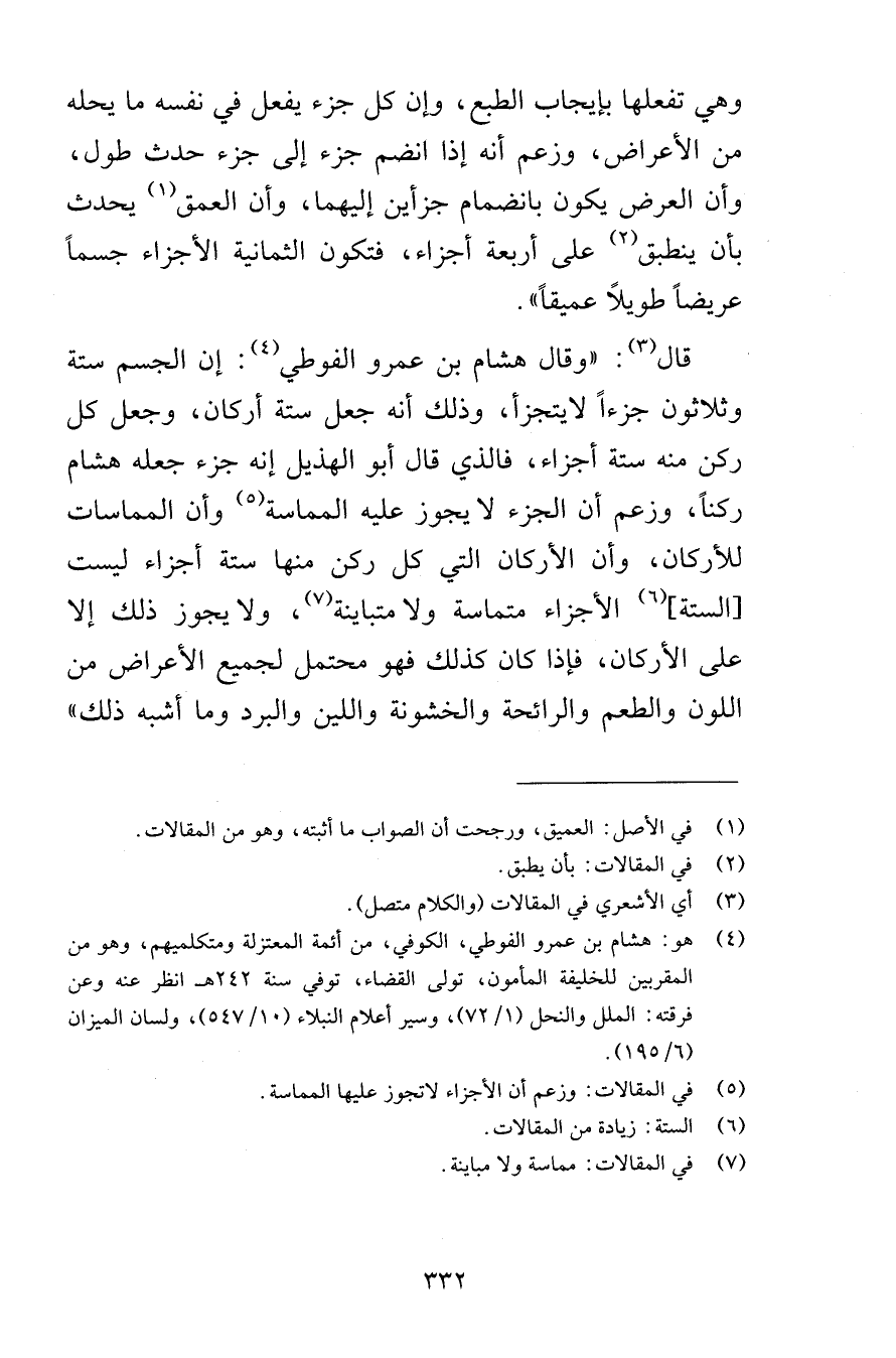 وهي تفعلها بإيجاب الطبع وإن كل جزء يفعل في نفسه ما يحله من الأعراض وزعم أنه إذا انضم جزء إلى جزء حدث طول وأن العرض يكون بانضمام جزأين إليهما وأن العمق يحدث بأن ينطبق على أربعة أجزاء فتكون الثمانية الأجزاء جسماً عريضاً طويلاً عميقاً قال وقال هشام بن عمرو الفوطي إن الجسم ستة وثلاثون جزءاً لايتجزأ وذلك أنه جعل ستة أركان وجعل كل ركن منه ستة أجزاء فالذي قال أبو الهذيل إنه جزء جعله هشام ركناً وزعم أن الجزء لا يجوز عليه المماسة وأن المماسات للأركان وأن الأركان التي كل ركن منها ستة أجزاء ليست الستة الأجزاء متماسة ولا متباينة ولا يجوز ذلك إلا على الأركان فإذا كان كذلك فهو محتمل لجميع الأعراض من اللون والطعم والرائحة والخشونة واللين والبرد وما أشبه ذلك