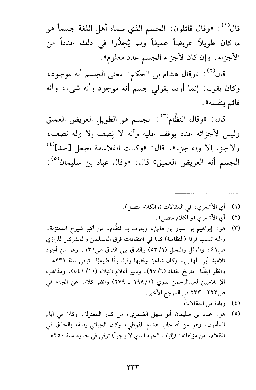 قال وقال قائلون الجسم الذي سماه أهل اللغة جسماً هو ما كان طويلاً عريضاً عميقاً ولم يُحِدُّوا في ذلك عدداً من الأجزاء وإن كان لأجزاء الجسم عدد معلوم قال وقال هشام بن الحكم معنى الجسم أنه موجود وكان يقول إنما أريد بقولي جسم أنه موجود وأنه شيء وأنه قائم بنفسه قال وقال النظَّام الجسم هو الطويل العريض العميق وليس لأجزائه عدد يوقف عليه وأنه لا نِصف إلا وله نصف ولا جزء إلا وله جزء قال وكانت الفلاسفة تجعل حد الجسم أنه العريض العميق قال وقال عباد بن سليمان
