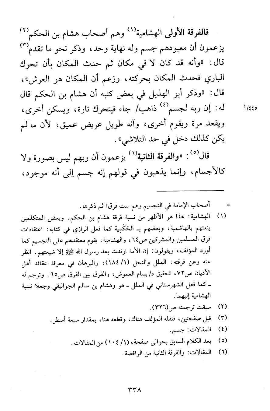 فالفرقة الأولى الهشامية وهم أصحاب هشام بن الحكم يزعمون أن معبودهم جسم وله نهاية وحد وذكر نحو ما تقدم قال وأنه قد كان لا في مكان ثم حدث المكان بأن تحرك الباري فحدث المكان بحركته وزعم أن المكان هو العرش قال وذكر أبو الهذيل في بعض كتبه أن هشام بن الحكم قال له إن ربه لجسم ذاهب جاء فيتحرك تارة ويسكن أخرى ويقعد مرة ويقوم أخرى وأنه طويل عريض عميق لأن ما لم يكن كذلك دخل في حد التلاشي قال والفرقة الثانية يزعمون أن ربهم ليس بصورة ولا كالأجسام وإنما يذهبون في قولهم إنه جسم إلى أنه موجود