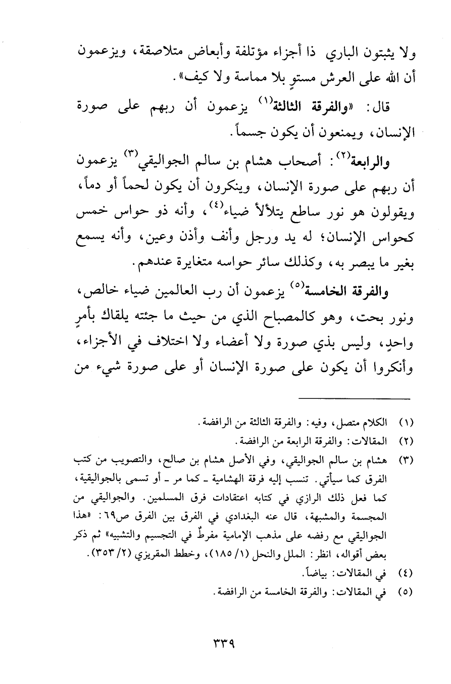 ولا يثبتون الباري ذا أجزاء مؤتلفة وأبعاض متلاصقة ويزعمون أن الله على العرش مستوٍ بلا مماسة ولا كيف قال والفرقة الثالثة يزعمون أن ربهم على صورة الإنسان ويمنعون أن يكون جسماً والرابعة أصحاب هشام بن سالم الجواليقي يزعمون أن ريهم على صورة الإنسان وينكرون أن يكون لحماً أو دماً ويقولون هو نور ساطع يتلألأ ضياء وأنه ذو حواس خمس كحواس الإنسان له يد ورجل وأنف وأذن وعين وأنه يسمع بغير ما يبصر به وكذلك سائر حواسه متغايرة عندهم والفرقة الخامسة يزعمون أن رب العالمين ضياء خالص ونور بحت وهو كالمصباح الذي من حيث ما جئته يلقاك بأمرٍ واحدٍ وليس بذي صورة ولا أعضاء ولا اختلاف في الأجزاء وأنكروا أن يكون على صورة الإنسان أو على صورة شيء من