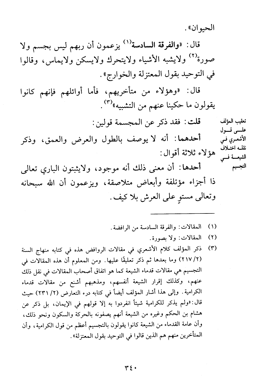 الحيوان قال والفرقة السادسة يزعمون أن ربهم ليس بجسم ولا صورة ولايشبه الأشياء ولايتحرك ولايسكن ولايماس وقالوا في التوحيد بقول المعتزلة والخوارج قال وهؤلاء من متأخريهم فأما أوائلهم فإنهم كانوا يقولون ما حكينا عنهم من التشبيه قلت فقد ذكر عن المجسمة قولين أحدهما أنه لا يوصف بالطول والعرض والعمق وذكر هؤلاء ثلاثة أقوال أحدها أن معنى ذلك أنه موجود ولايثبتون الباري تعالى ذا أجزاء مؤتلفة وأبعاض متلاصقة ويزعمون أن الله سبحانه وتعالى مستوٍ على العرش بلا كيف