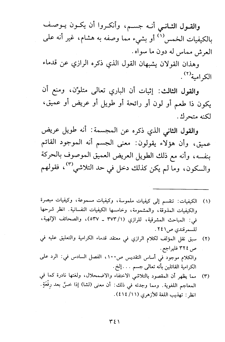 والقول الثاني أنه جسم وأنكروا أن يكون يوصف بالكيفيات الخمس أو بشيء مما وصفه به هشام غير أنه على العرش مماس له دون ما سواه وهذان القولان يشبهان القول الذي ذكره الرازي عن قدماء الكرامية والقول الثالث إثبات أن الباري تعالى متلوِّن ومنع أن يكون ذا طعم أو لون أو رائحة أو طويل أو عريض أو عميق لكنه متحرك والقول الثاني الذي ذكره عن المجسمة أنه طويل عريض عميق وأن هؤلاء يقولون معنى الجسم أنه الموجود القائم ينفسه وأنه مع ذلك الطويل العريض العميق الموصوف بالحركة والسكون وما لم يكن كذلك دخل في حد التلاشي فقولهم