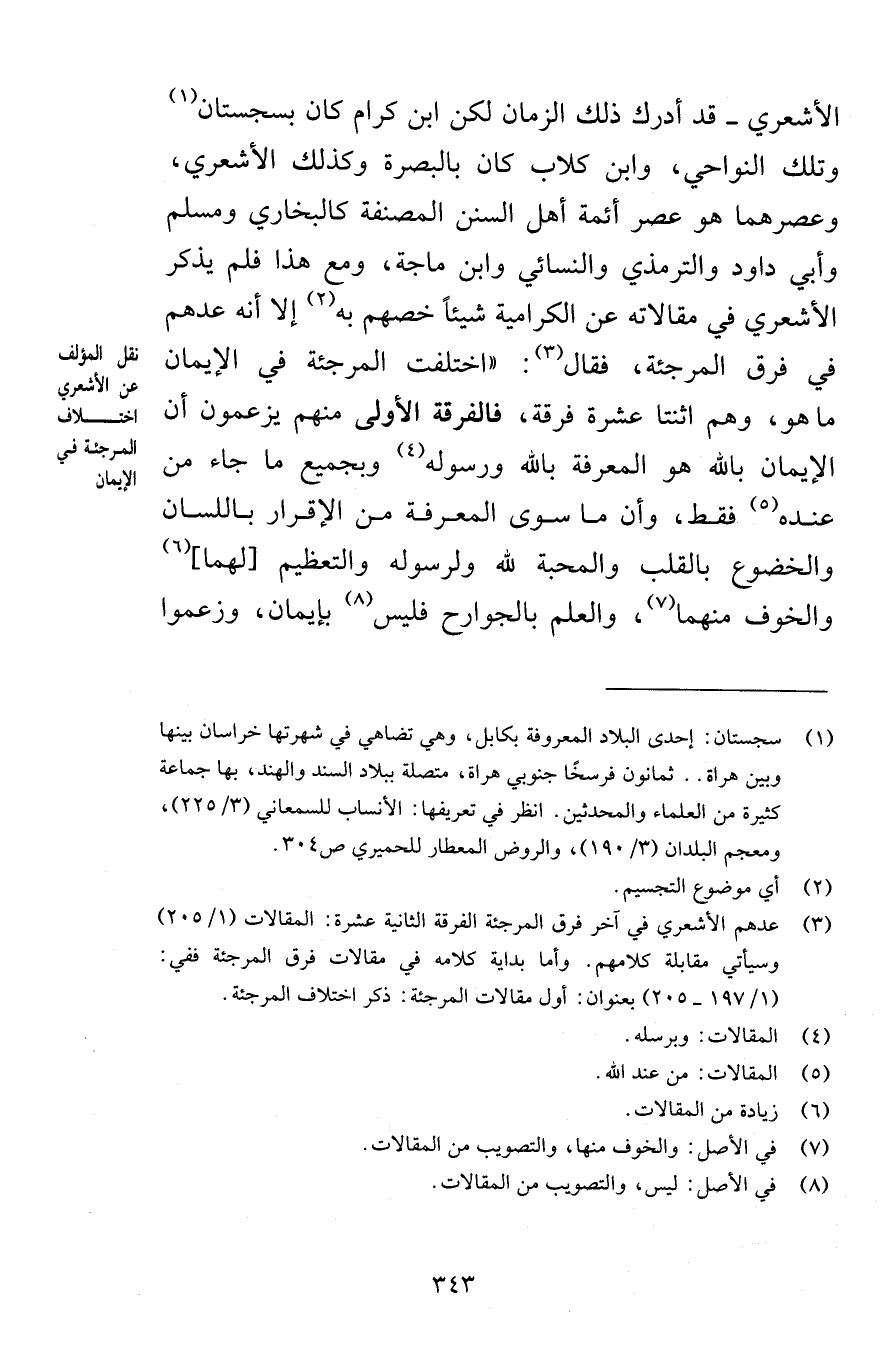 الأشعري قد أدرك ذلك الزمان لكن ابن كرام كان بسجستان وتلك النواحي وابن كلاب كان بالبصرة وكذلك الأشعري وعصرهما هو عصر أئمة أهل السنن المصنفة كالبخاري ومسلم وأبي داود والترمذي والنسائي وابن ماجة ومع هذا فلم يذكر الأشعري في مقالاته عن الكرامية شيئاً خصهم به إلا أنه عدهم في فرق المرجئة فقال اختلفت المرجئة في الإيمان ما هو وهم اثنتا عشرة فرقة فالفرقة الأولى منهم يزعمون أن الإيمان بالله هو المعرفة بالله ورسوله وبجميع ما جاء من عنده فقط وأن ما سوى المعرفة من الإقرار باللسان والخضوع بالقلب والمحبة لله ولرسوله والتعظيم لهما والخوف منهما والعلم بالجوارح فليس بإيمان وزعموا