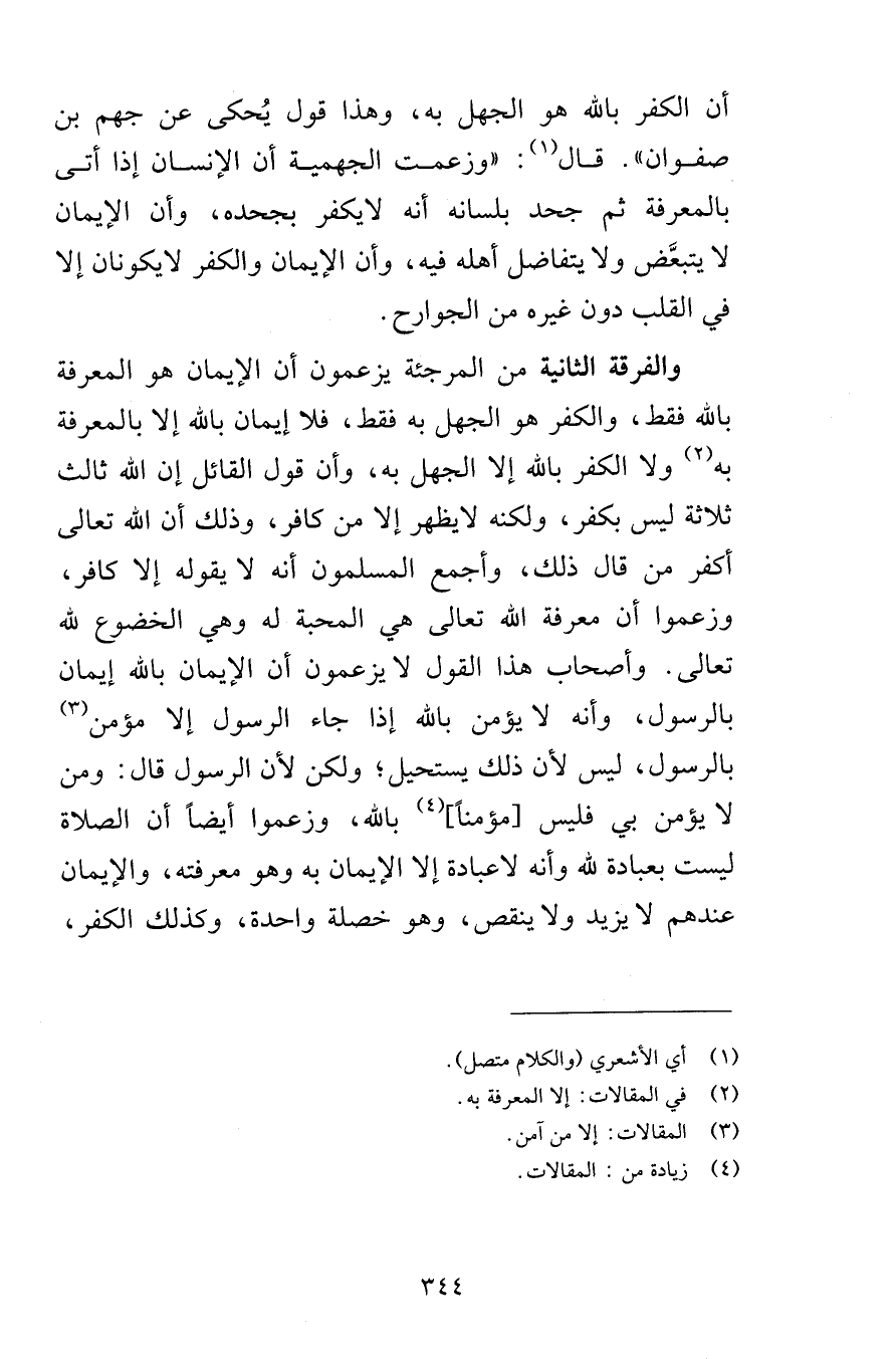 أن الكفر بالله هو الجهل به وهذا قول يُحكى عن جهم بن صفوان قال وزعمت الجهمية أن الإنسان إذا أتى بالمعرفة ثم جحد بلسانه أنه لايكفر بجحده وأن الإيمان لا يتبعَّض ولا يتفاضل أهله فيه وان الإيمان والكفر لايكونان إلا في القلب دون غيره من الجوارح والفرقة الثانية من المرجئة يزعمون أن الإيمان هو المعرفة بالله فقط والكفر هو الجهل به فقط فلا إيمان بالله إلا بالمعرفة به ولا الكفر بالله إلا الجهل به وأن قول القائل إن الله ثالث ثلاثة ليس بكفر ولكنه لايظهر إلا من كافر وذلك أن الله تعالى أكفر من قال ذلك وأجمع المسلمون انه لا يقول إلا كافر وزعموا أن معرفة الله تعالى هي المحبة له وهي الخضوع لله تعالى وأصحاب هذا القول لا يزعمون أن الإيمان بالله إيمان بالرسول وأنه لا يؤمن بالله إذا جاء الرسول إلا مؤمن بالرسول ليس لأن ذلك يستحيل ولكن لأن الرسول قال من لا يؤمن بي فليس مؤمناً بالله وزعموا أيضاً أن الصلاة ليست بعبادة لله وأنه لاعبادة إلا الإيمان به وهو معرفته والإيمان عندهم لا يزيد ولا ينقص وهو خصلة واحدة وكذلك الكفر