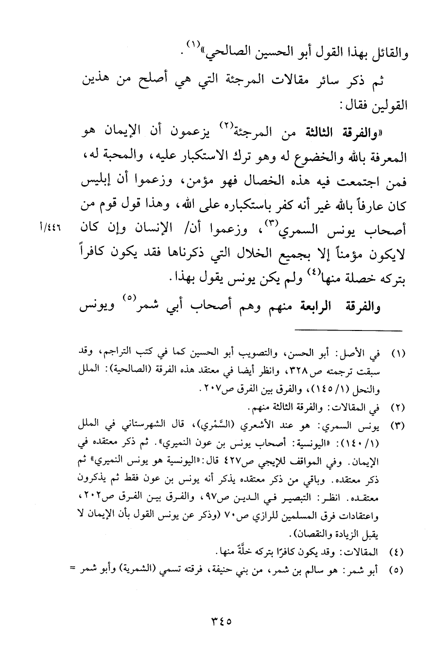 والقائل بهذا القول أبي الحسين الصالحي ثم ذكر سائر مقالات المرجئة التي هي أصلح من هذين القولين فقال والفرقة الثالثة من المرجئة يزعمون أن الإيمان هو المعرفة بالله والخضوع له وهو ترك الاستكبار عليه والمحبة له فمن اجتمعت فيه هذه الخصال فهو مؤمن وزعموا أن إبليس كان عارفاً بالله غير أنه كفر باستكباره على الله وهذا قول قوم من أصحاب يونس السمري وزعموا أن الإنسان وإن كان لايكون مؤمناً إلا بجميع الخلال التي ذكرناها فقد يكون كافراً بتركه خصلة منها ولم يكن يونس يقول بهذا والفرقة الرابعة منهم وهم أصحاب أبي شمر ويونس