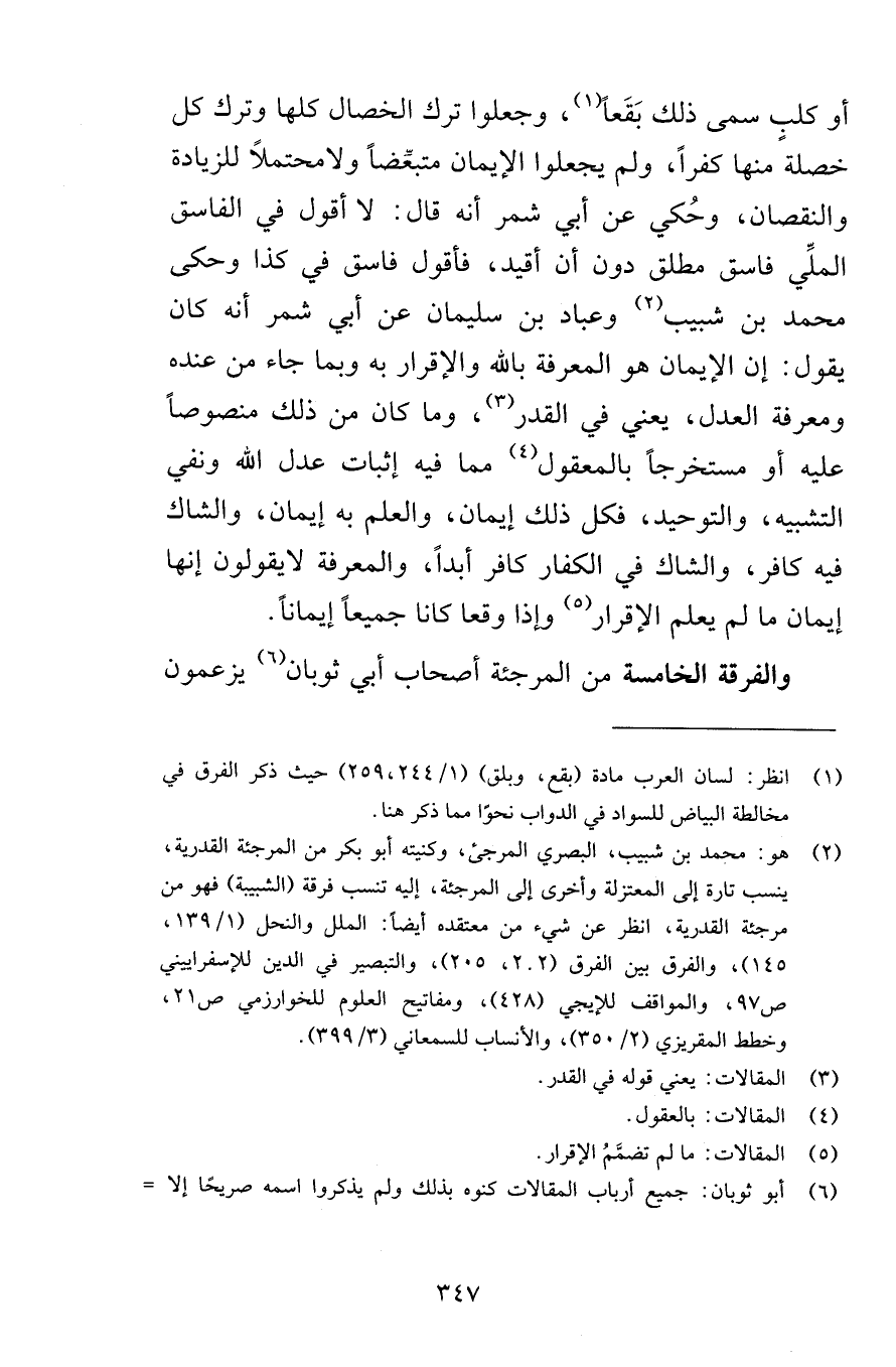 أو كلبٍ سمى بَقَعاً وجعلوا ترك الخصال كلها وترك كل خصلة منها كفراً ولم يجعلوا الإيمان متبعِّضاً ولامحتملاً للزيادة والنقصان وحُكي عن أبي شمر أنه قال لا أقول في الفاسق الملِّي فاسق مطلق دون أن أقيد فأقول فاسق في كذا وحكى محمد بن شبيب وعباد بن سليمان عن أبي شمر أنه كان يقول إن الإيمان هو المعرفة بالله والإقرار به وبما جاء من عنده ومعرفة العدل يعني في القدر وما كان من ذلك منصوصاً عليه أو مستخرجاً بالمعقول مما فيه إثبات عدل الله ونفي التشبيه والتوحيد فكل ذلك إيمان والعلم به إيمان والشاك فيه كافر الشاك في الكفار كافر أبداً والمعرفة لايقولون إنها إيمان ما لم يعلم الإقرار وإذا وقعا كانا جميعاً إيماناً والفرقة الخامسة من المرجئة أصحاب أبي ثوبان يزعمون