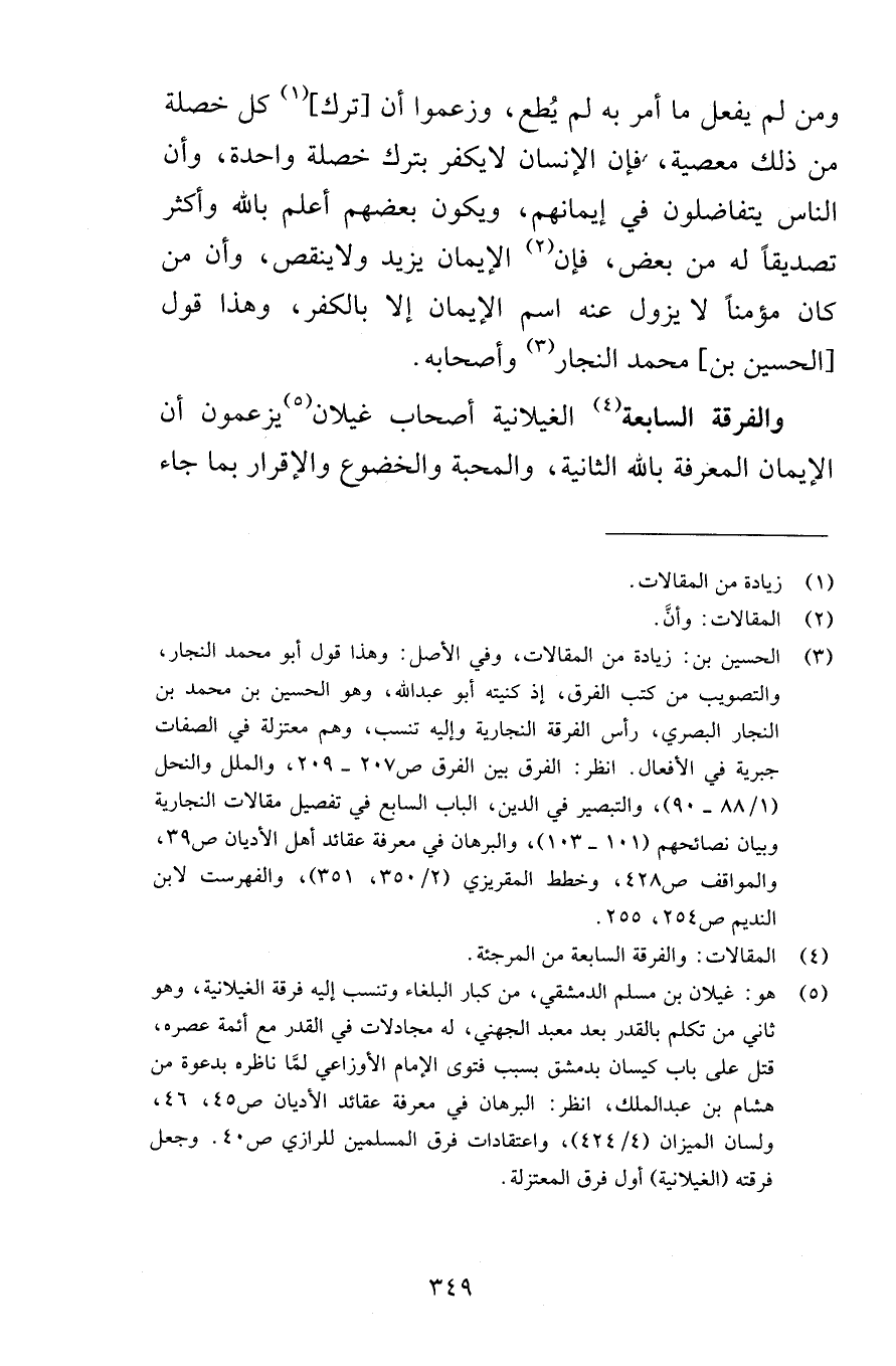 ومن لم يفعل ما أمر به لم يُطع وزعموا أن ترك كل خصلة من ذلك معصية فإن الإنسان لايكفر بترك خصلة واحدة وأن الناس يتفاضلون في إيمانهم ويكون بعضه أعلم بالله وأكثر تصديقاً له من بعض فإن الإيمان يزيد ولاينقص وأن من كان مؤمناً لا يزول عنه اسم الإيمان إلا بالكفر وهذا قول الحسين بن محمد النجار وأصحابه والفرقة السابعة الغيلانية أصحاب غيلان يزعمون أن الإيمان المعرفة بالله الثانية والمحبة والخضوع والإقرار بما جاء