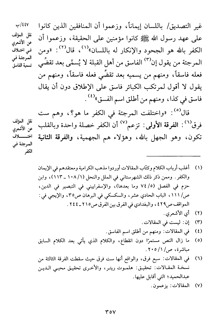 غير التصديق باللسان إيماناً وزعموا أن المنافقين الذين كانوا على عهد رسول الله صلى الله عليه وسلم كانوا مؤمنين على الحقيقة وزعموا أن الكفر بالله هو الجحود والإنكار له باللسان قال ومن المرجئة من يقول إن الفاسق من أهل القبلة لا يُسمَّى بعد تقضِّي فعله فاسقاً ومنهم من يقول لا أقول لمرتكب الكبائر فاسق على الإطلاق دون أن يقال فاسق في كذا ومنهم من أطلق اسم الفسق قال واختلفت المرجئة في الكفر ما هو وهم ست فرق الفرقة الأولى تزعم أن الكفر خصلة واحدة وبالقلب تكون وهو الجهل بالله وهؤلاء هم الجهمية والفرقة الثانية