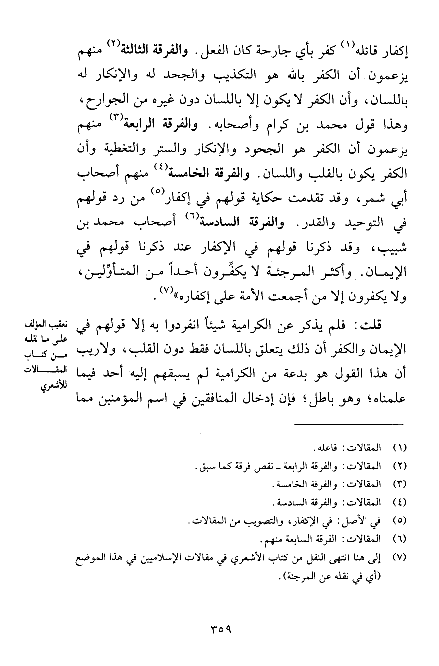 إكفار قائله كفر بأي جارحة كان الفعل والفرقة الثالثة منهم يزعمون أن الكفر بالله هو التكذيب والجحد له والإنكار له باللسان وأن الكفر لا يكون إلا باللسان دون غيره من الجوارح وهذا قول محمد بن كرام وأصحابه والفرقة الرابعة منهم يزعمون أن الكفر هو الجحود والإنكار والستر والتغطية وأن الكفر يكون بالقلب واللسان والفرقة الخامسة منهم أصحاب أبي شمر وقد تقدمت حكاية قولهم في إكفار من رد قولهم في التوحيد والقدر والفرقة السادسة أصحاب محمد بن شبيب وقد ذكرنا قولهم في الإكفار عند ذكرنا قولهم في الإيمان وأكثر المرجئة لا يكفِّرون أحداً من المتأوِّلين ولا يكفرون إلا من جمعت الأمة على إكفاره قلت فلم يذكر عن الكرامية شيئاً انفردوا به إلا قولهم في الإيمان والكفر أن ذلك يتعلق باللسان فقط دون القلب ولاريب أن هذا القول هو بدعة من الكرامية لم يسبقه إليه أحد فيما علمناه وهو باطل فإن إدخال المنافقين في اسم المؤمنين مما
