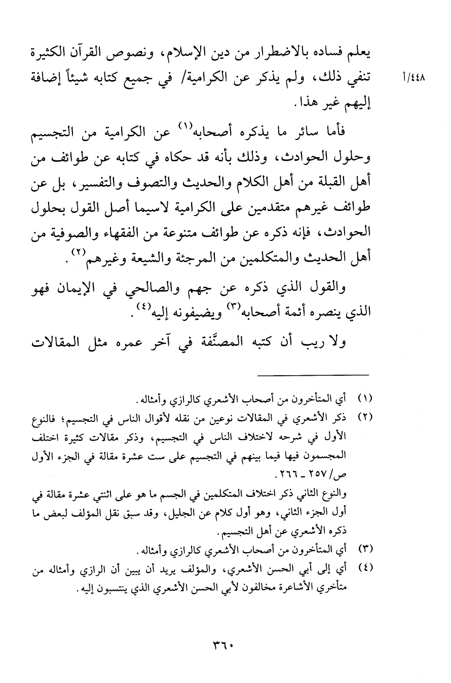 يعلم فساده بالاضطرار من دين الإسلام ونصوص القرآن الكثيرة تنفي ذلك ولم يذكر عن الكرامية في جميع كتابه شيئاً إضافة إليهم غير ذلك فأما سائر ما يذكره أصحابه من الكرامية من التجسيم وحلول الحوادث وذلك بأنه قد حكاه في كتابه عن طوائف من أهل القبلة من أهل الكلام والحديث والتصوف والتفسير بل عن طوائف غيرهم متقدمين على الكرامية لاسيما أصل القول بحلول الحوادث فإنه ذكره عن طوائف متنوعة من الفقهاء والصوفية من أهل الحديث والمتكلمين من المرجئة والشيعة وغيرهم والقول الذي ذكره عن جهم والصالحي في الإيمان فهو الذي ينصره أئمة أصحابه ويضيفونه إليه ولا ريب أن كتبه المصنَّفة في آخر عمره مثل المقالات